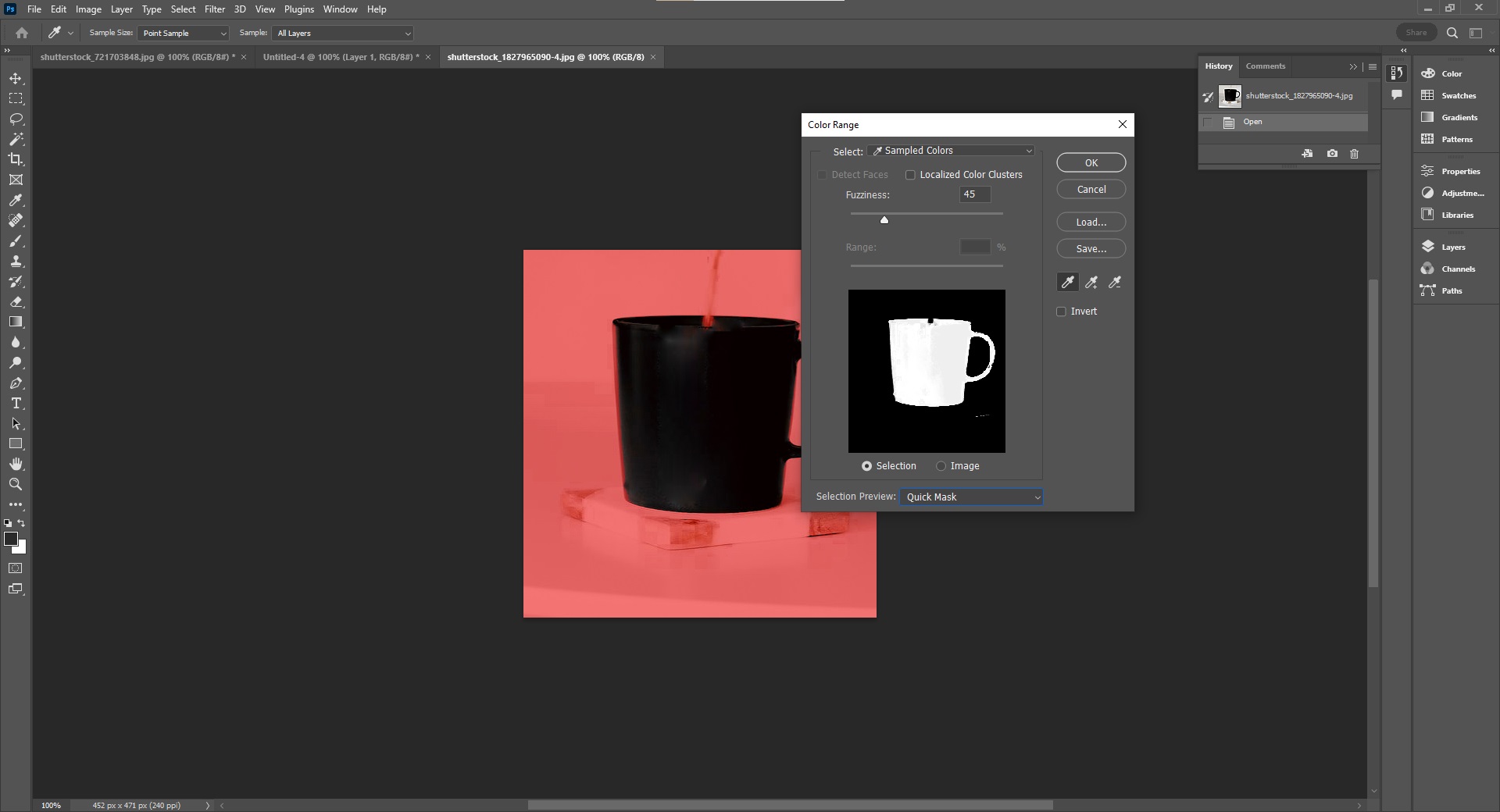 The three tools "Magic Wand", "Colour Range Selection" and "Quick Selection" have different methods of selecting items and each have advantages in different situations. We are using Photoshop version 24.1.1. Some tools may not be available in older versions.