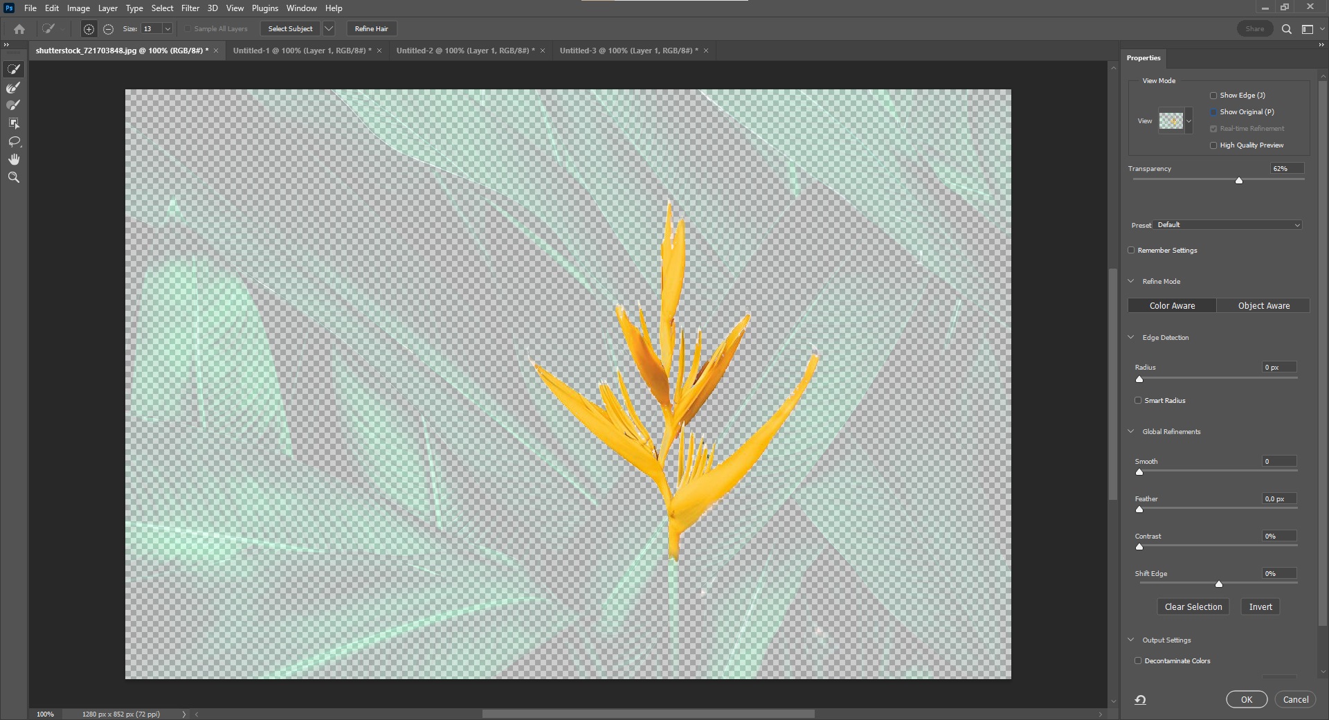 To prevent parts of the image from being cut off, moderate values should be selected for subjects as detailed as our example. Experiment with different values and carefully observe their effect. To be able to copy your cropped object later and paste it into a new image, select the ‘Output to new document’ under the item "Output settings" in the right bar. And your object cut out and ready for the next stage.