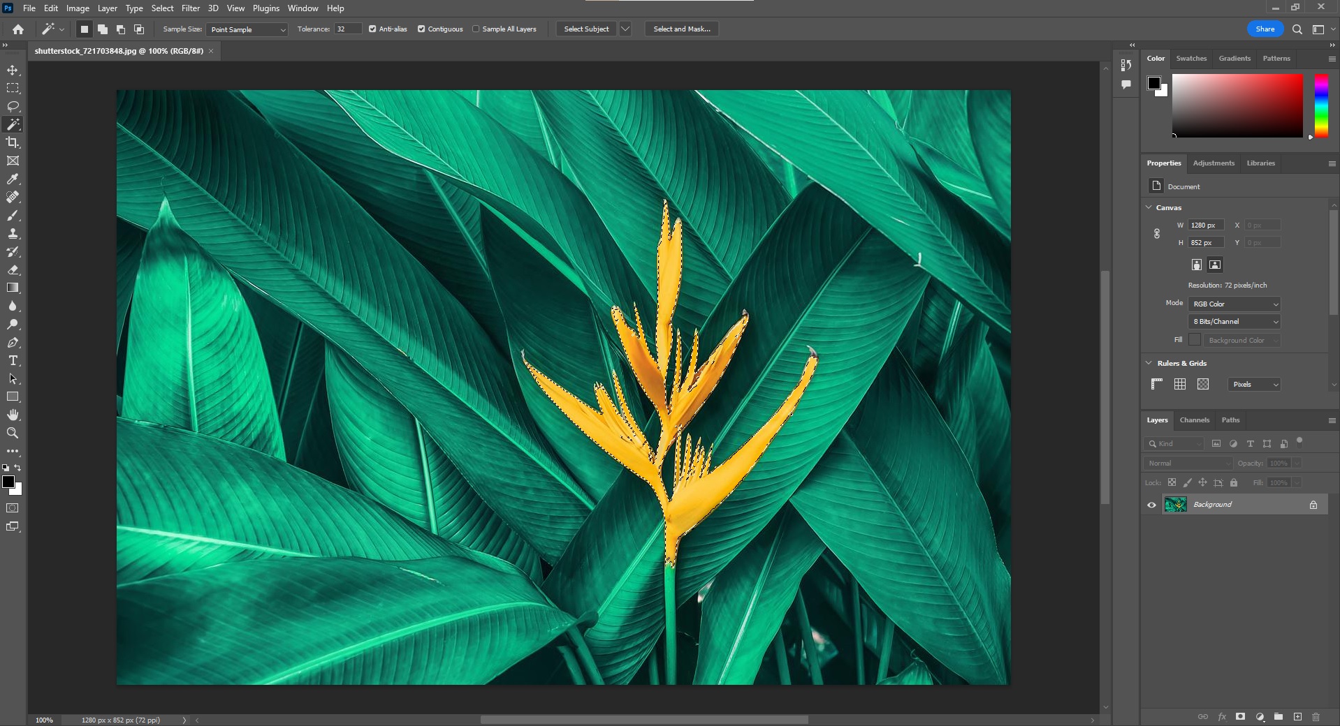 First open your image in Photoshop for cropping. In this example, we will be cutting out the yellow flower using the magic wand.
