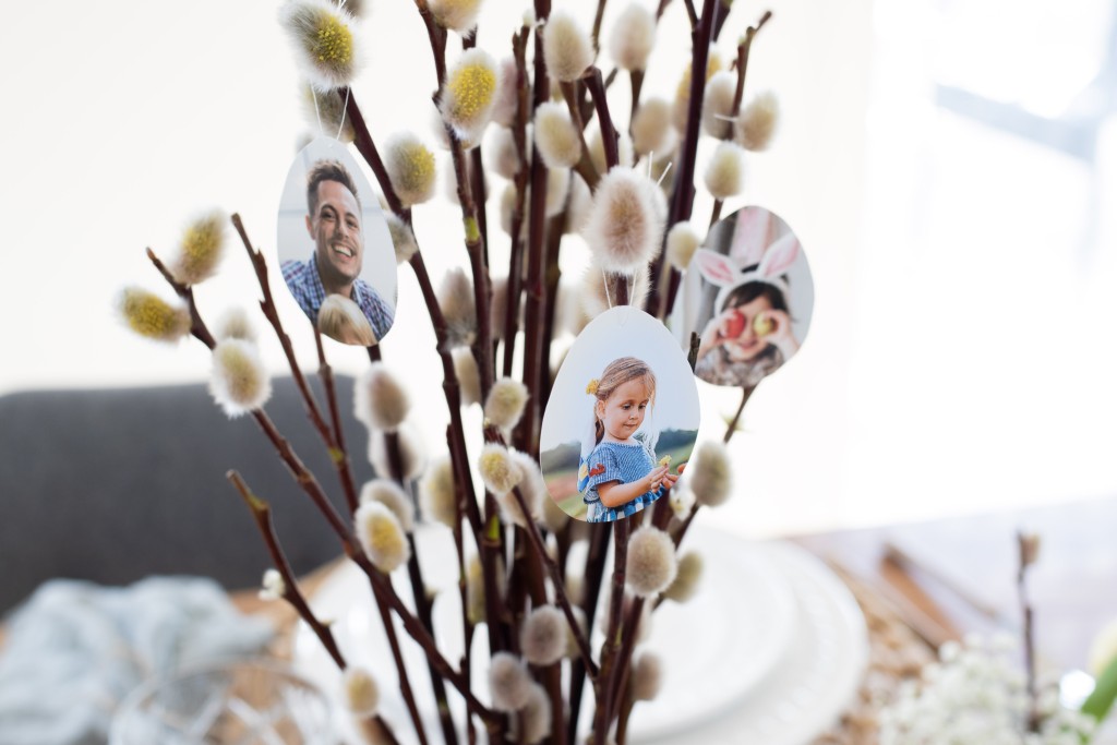 For the ornaments, cut the photos of your loved ones into the shapes of Easter eggs. Glue each egg on the back so that each egg has a picture on either side. Using a needle, carefully poke a hole in the egg and pull the thread through. Knot both ends of the thread together and hang it on your pussy willow bouquet.