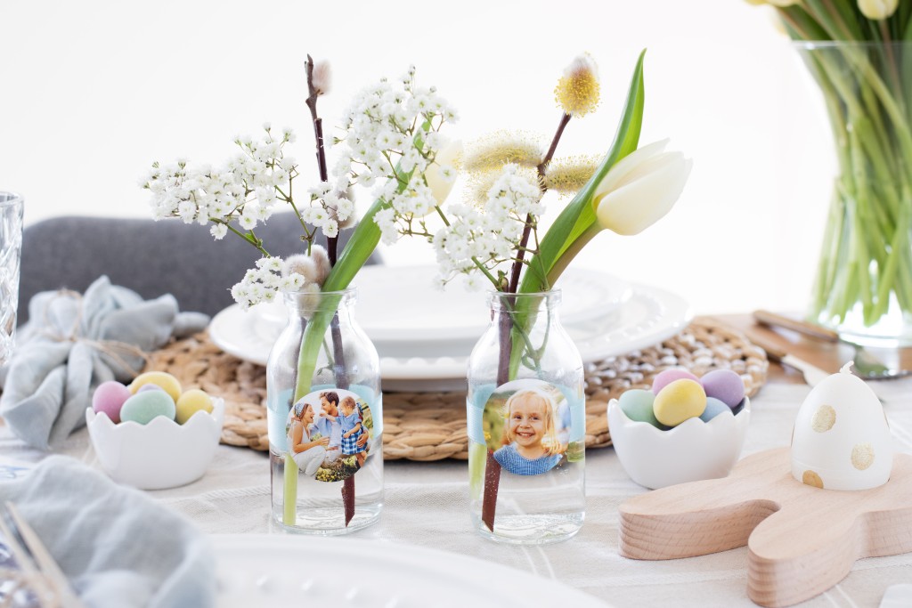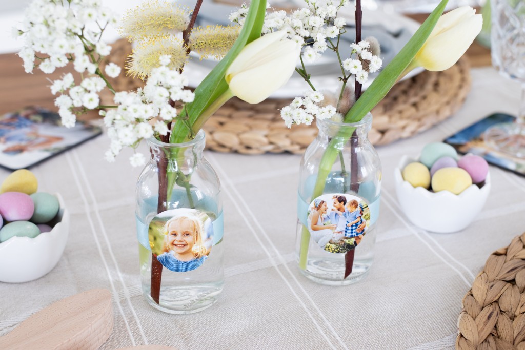 To give a spring feeling to your table, you can decorate it with fresh flowers in vibrant colours - some of which you might find in your own garden. You can turn any vase into a lovely centrepiece simply by adding some photo stickers. The stickers stand out really well when you place them in the centre of a small doily. Attach it to the vase with a pretty, thin ribbon.