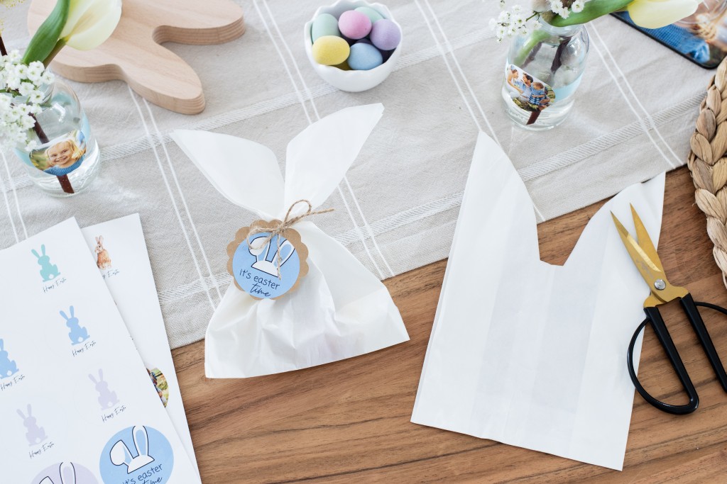 To create a nifty bunny-ears shape, cut the opening so a pair of ears emerges from the bag. Now you can fill the bag with tiny surprises: various sweets, homemade biscuits and colourful Easter eggs. Tie your bag together with some ribbon and now your gift for your Easter brunch guests is ready to go! Use some round ifolor Photo Stickers for personalised gift tags. Design your own individual photo stickers with Easter designs or with photos taken during spring. Simply stick the stickers onto the round gift tags, tie them to the Easter bags and voilà your little Easter gift bags are ready for your guests.