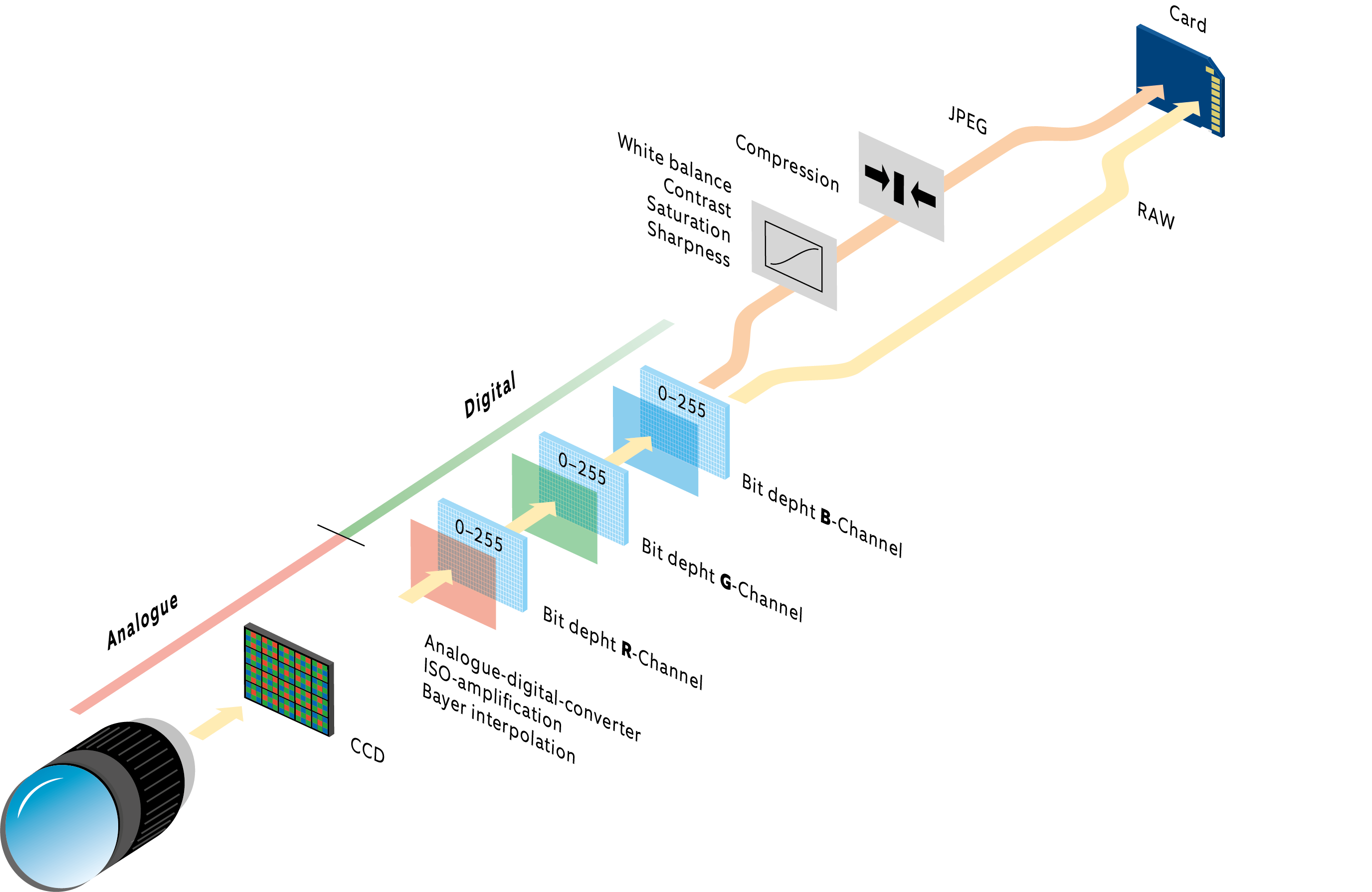 RAW is an interim result, not a standard. RAW splits digital photography into shooting and developing. With JPG, the camera does the "development work" when the shot is taken, while with RAW, this is done manually. This means there are many more options for editing the image. This requires software with a RAW converter. After developing, the photos are exported in JPG format in order to make products of all kinds.