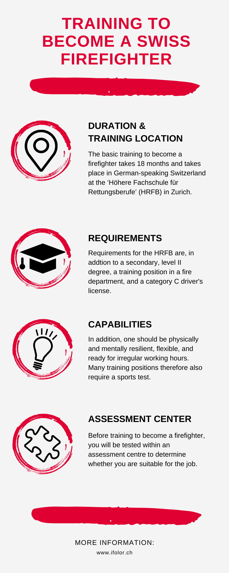 The basic training to become a firefighter takes 18 months and takes place in German-speaking Switzerland at the ‘Höhere Fachschule für Rettungsberufe’ (HRFB) in Zurich. Requirements for the HRFB are a secondary, level II degree (e.g. secondary school exit exams qualification or a completed vocational training with a federal certificate of proficiency), a training position in a fire department, and a category C driver's license. In addition, one should be physically and mentally resilient, flexible, and ready for irregular working hours. Many training positions therefore also require a sports test and an assessment center to determine whether you are suitable for the job. The ideal age for training with the professional fire department is between 23 and 35 years.