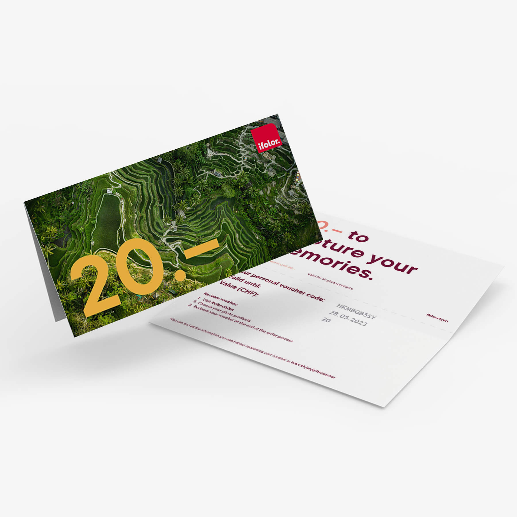 Order the ifolor gift voucher for 20, 50, or 100 to give your loved ones the freedom of choice. If the value of your voucher is higher than the total order amount, the remaining credit will be credited to your customer account. The remaining credit will automatically be deducted from a subsequent order. The recipient can place several orders.