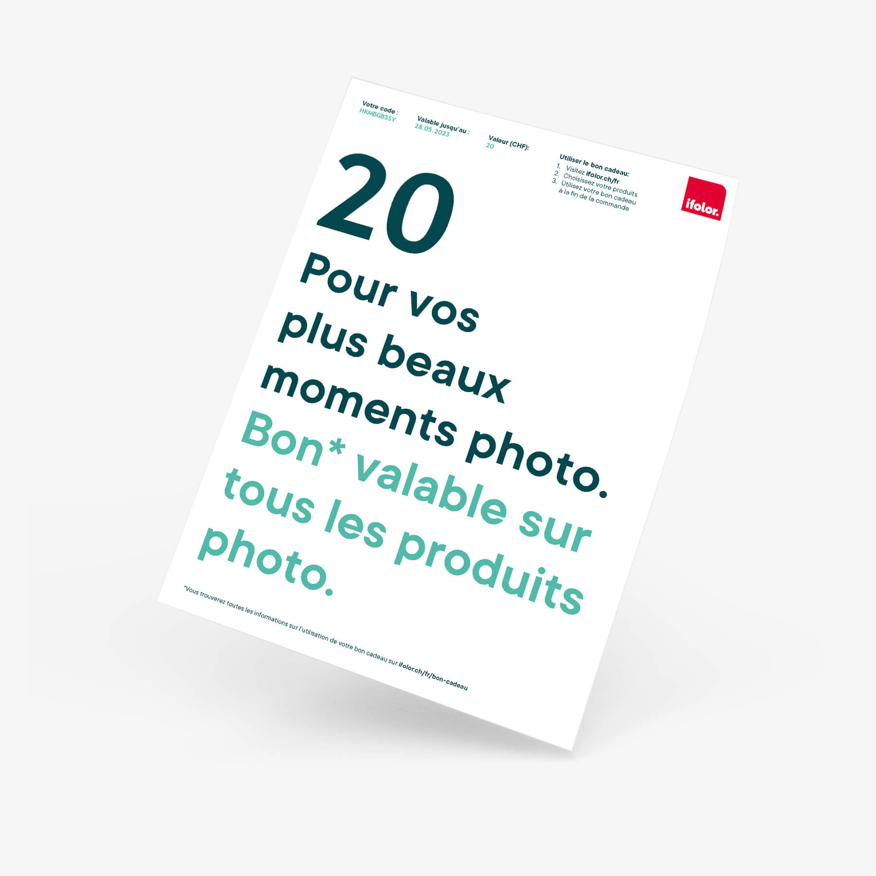 Commandez le Bon cadeau ifolor au montant de 20, 50 ou 100 et offrez-le à vos proches. Si la valeur du bon cadeau ne suffit pas à couvrir le montant de la commande, il est possible de choisir l’un des autres modes de paiement que nous proposons pour régler la différence. Le bénéficiaire puisse effectuer plusieurs commandes.