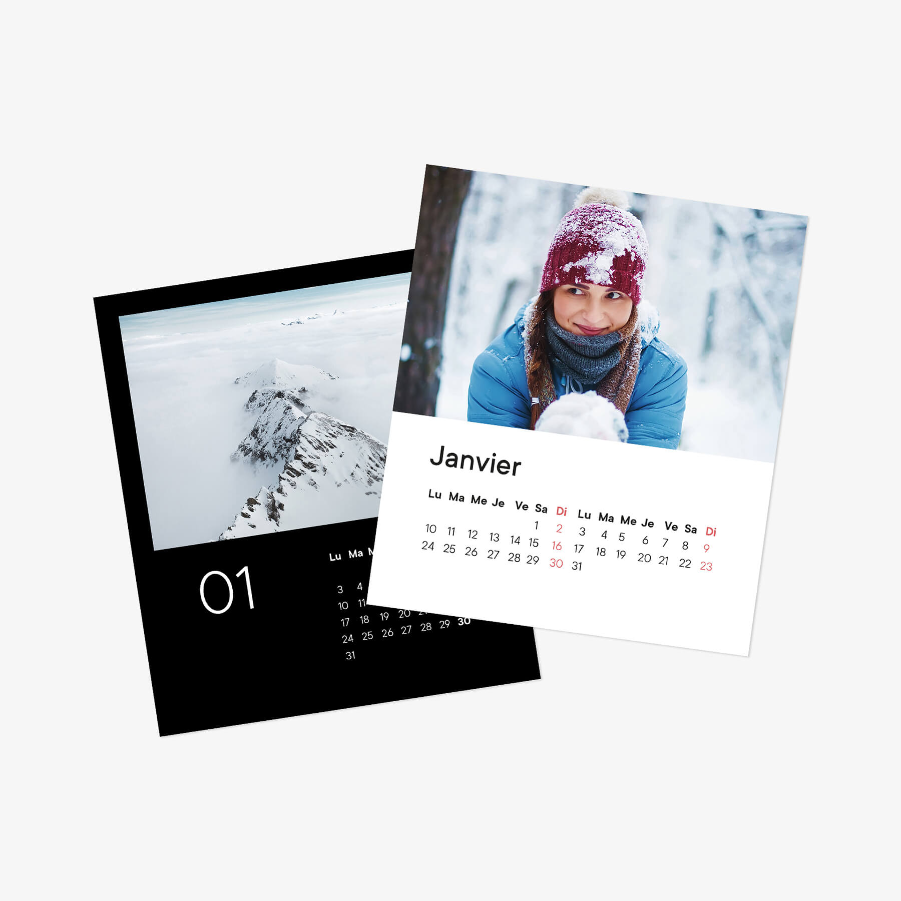 Nous imprimons les 12 cartes mensuelles ainsi que la couverture de votre calendrier de bureau dans une qualité optimale, de sorte que vos photos resplendissent de leurs plus belles couleurs. Le papier naturel sans bois d’une épaisseur de 290 g / m² est très rugueux et attribue au papier un toucher unique. Choisissez le mois par lequel votre calendrier de bureau doit commencer.