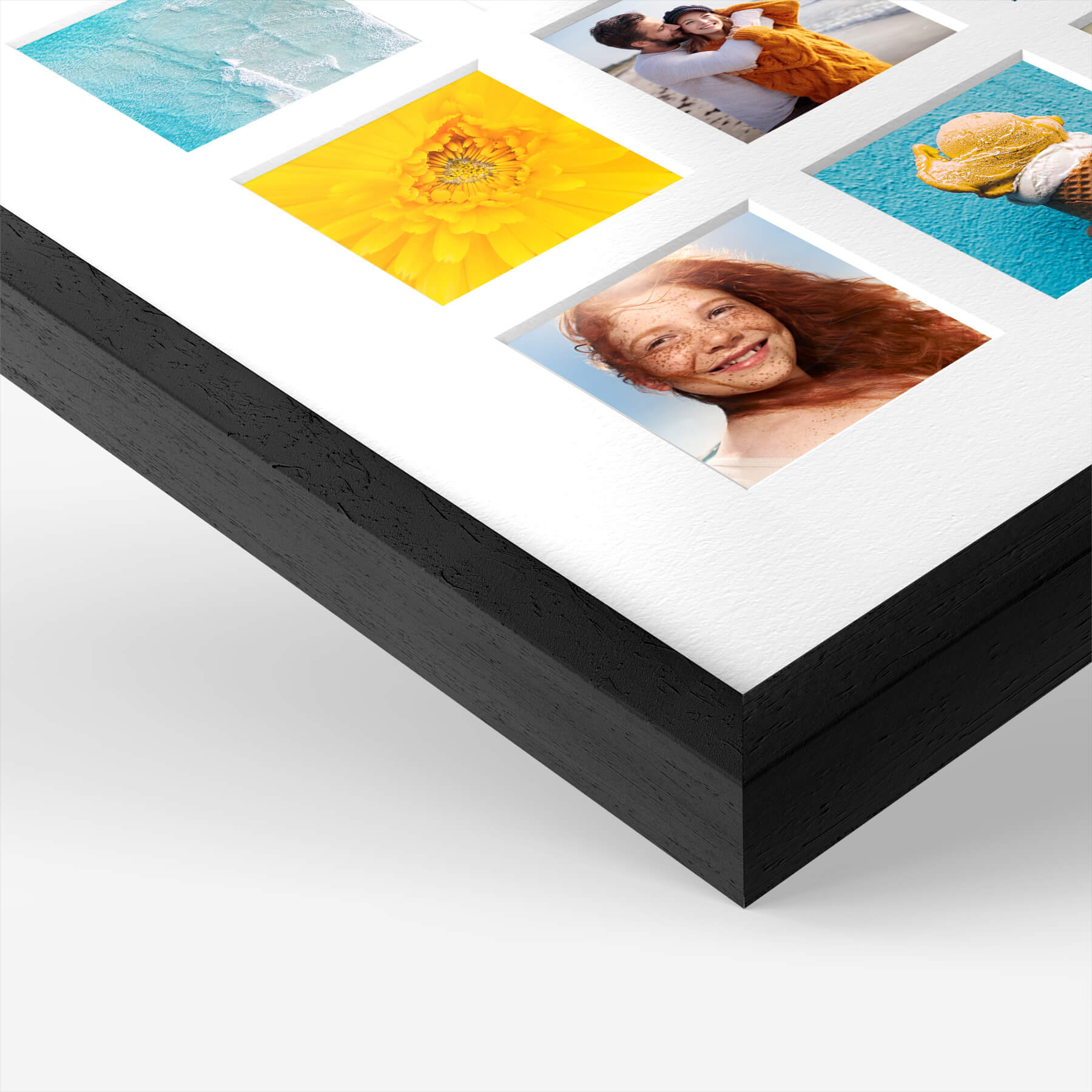 Choisissez entre le format 50x70 cm avec 4, 6 ou 24 photos et le format 40x110 cm avec 3, 4 ou 52 photos pour votre Collage photos avec cadre de galerie. Nous imprimons vos images préférées sur un Poster photo à la finition brillante en utilisant la toute dernière technologie à jet d'encre 8 couleurs, qui garantit des couleurs riches et contrastées. L’élégance du cadre photo, d'une largeur de 2 cm et d'une profondeur de 3,2 cm, apportera la touche finale à votre œuvre d’art.