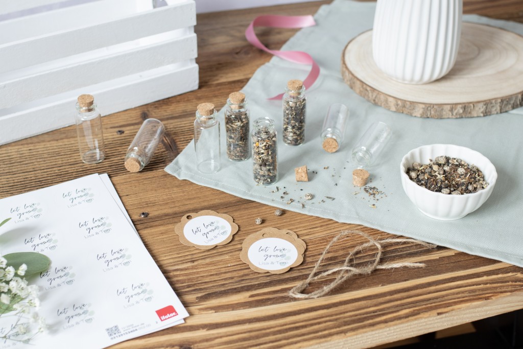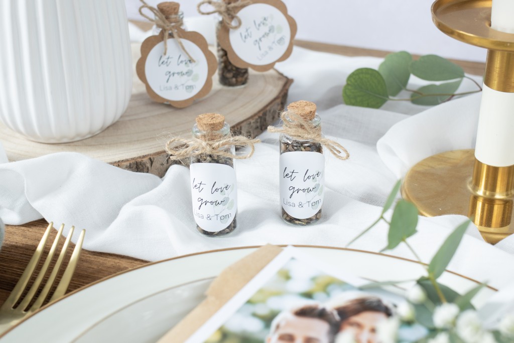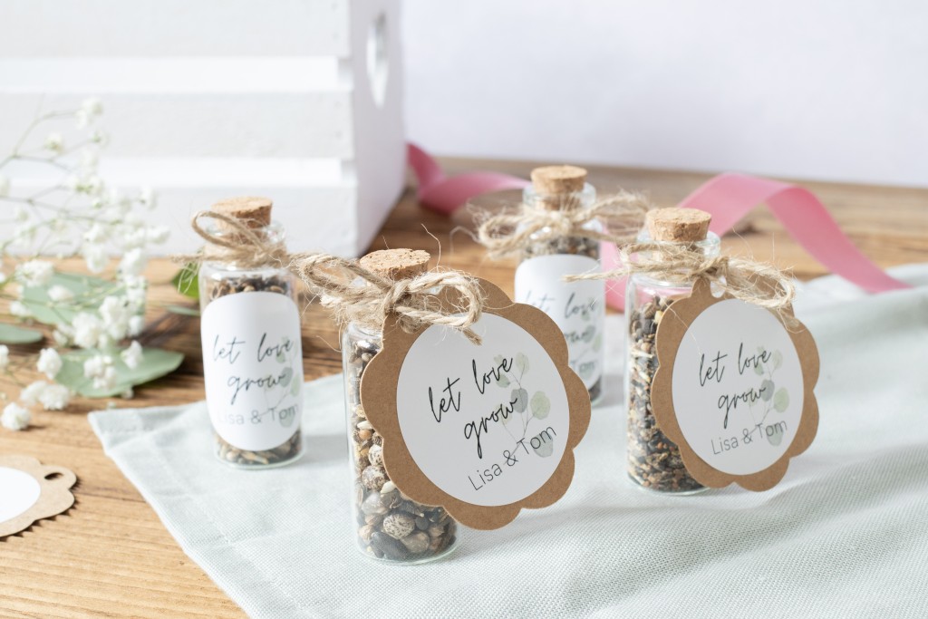 Les graines de fleurs à faire pousser sont un cadeau symbolique et pratique pour les personnes invitées à votre fête: elles symbolisent l’amour grandissant des mariés. Selon l’idée «Faites grandir notre amour», vous pouvez offrir votre propre mélange de graines à vos proches présents au mariage. Emballé joliment dans une fiole en verre et décoré de rubans colorés, de stickers ou d’un petit mot, vos invités auront encore beaucoup de plaisir à utiliser ce cadeau, même longtemps après l’évènement.