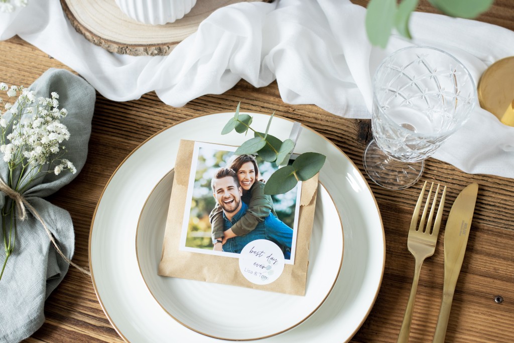 Ce cadeau sera d’autant unique si vous l’offrez avec une jolie photo de vous deux. Pour ceci, utilisez nos tirages photo carrés et choisissez un instant photo de vos fiançailles, par exemple. À l’aide d’une petite pince, accrochez les Square Prints aux sachets avec une petite branche d’eucalyptus. Pour le bonheur des jeunes convives, vous pouvez ajouter d’autres petites sucreries aux dragées dans la pochette cadeau.