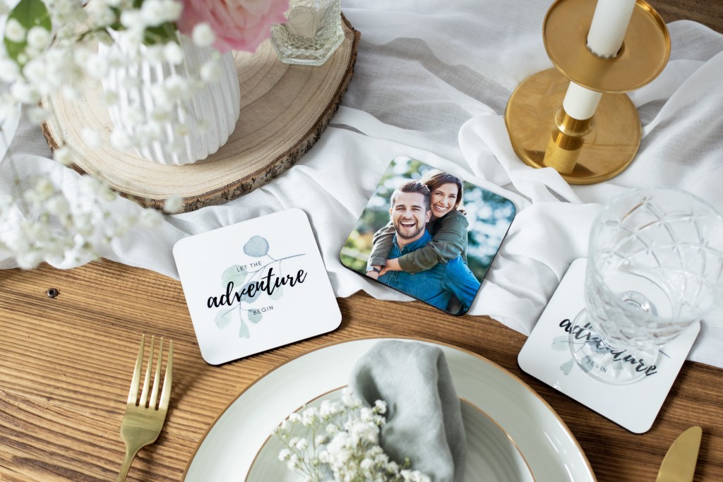 Les dessous de verre sont des cadeaux pratiques et individuels, aussi ils remplissent plusieurs fonctions: comme étiquette à nom pour votre plan de table, mais également comme faveur de mariage. À l’aide de notre éditeur en ligne, vous pouvez mettre un nom sur chaque dessous de verre, avec par exemple le logo ou le design de votre mariage, afin de les intégrer à votre décoration de table. De même que vous pouvez décorer les dessous de verre avec une photo de vous deux ou avec un de vos dictons préférés, et les offrir par set de 4 ou de 8 à vos invité·es.