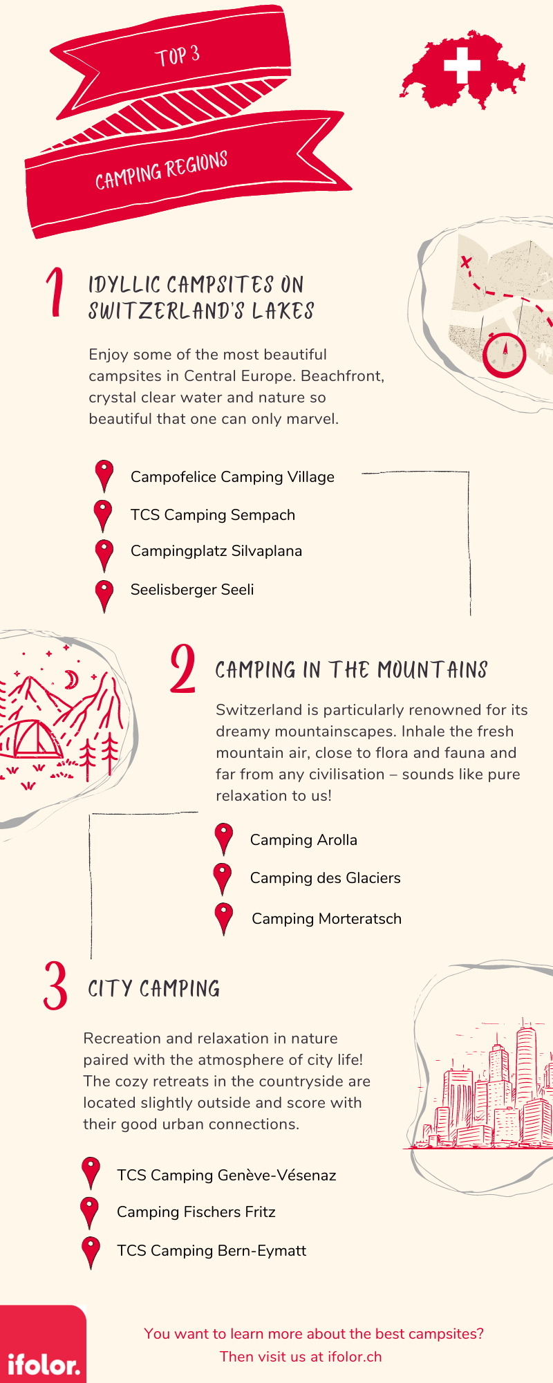 Profiter du soleil à la montagne ou au bord du lac pendant la journée, dormir à la belle étoile la nuit - ça a l'air génial, n'est-ce pas ? Et vous n'avez même pas besoin d'aller loin pour le faire ! Depuis quelques années, le camping connaît un succès remarquable. Pour nous c’est génial, il n'y a rien de mieux que de se détendre dans la nature ! Les campings suisses, en particulier, sont parmi les plus beaux d'Europe centrale et sont visités chaque année par des Allemands, des Suisses et de nombreuses autres nationalités des pays voisins. Si vous aussi, vous êtes tenté par des vacances en plein air cette année, jetez un coup d’œil à notre classement des meilleurs campings de Suisse. Voici nos 10 favoris :