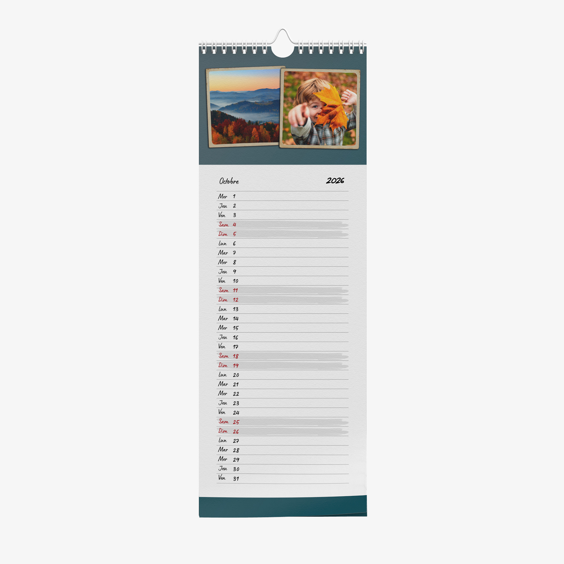 Grâce à son format fin de 15 x 42 cm, le calendrier de cuisine ifolor trouve sa place dans tous les foyers, surtout dans la cuisine! Le calendrier vous offre beaucoup d’espace pour noter les rendez-vous, les anniversaires et autres dates importantes. Lors de la conception de votre calendrier de cuisine personnalisé, vous pouvez choisir parmi différents modèles et designs. Selon la mise en page choisie, vous pouvez placer jusqu’à deux photos sur chaque page du calendrier et jusqu’à trois photos sur la page de couverture.