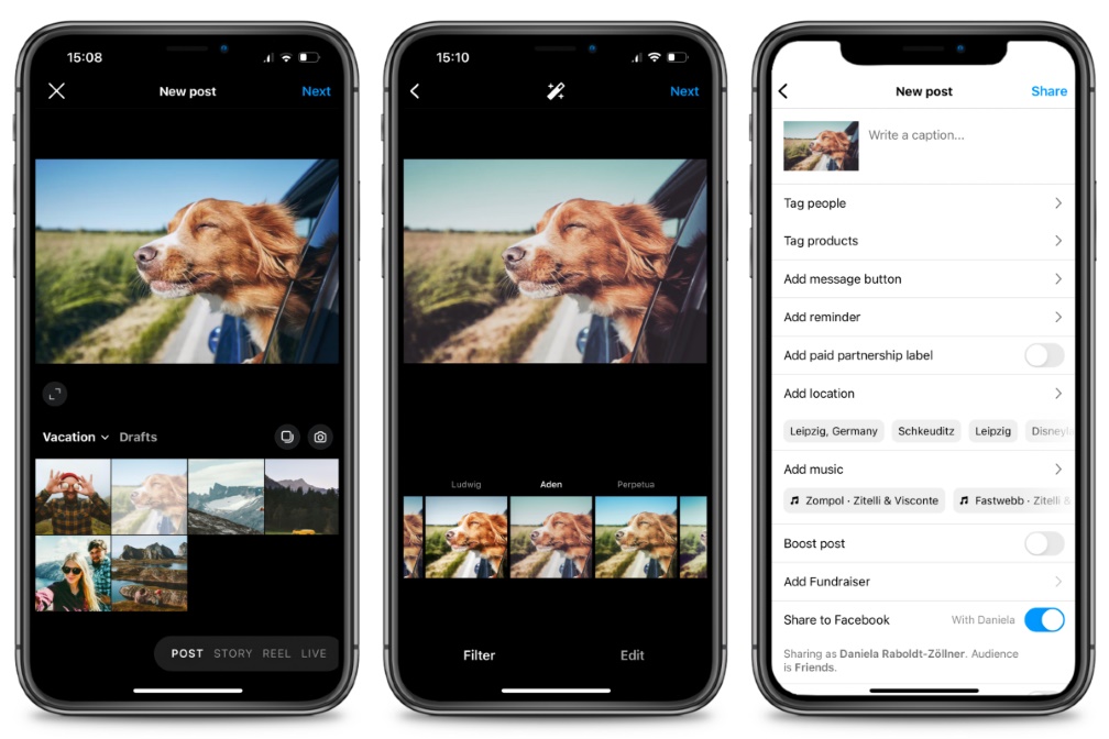 Bevor du ein Bild oder ein Reel veröffentlichst, stehen dir noch zahlreiche Möglichkeiten zur Bild- und Videobearbeitung zur Verfügung. Neben den klassischen Instagram Filtern lassen sich deine Bilder in der Helligkeit, Wärme, Schärfe oder Sättigung anpassen. Möchtest du hingegen ein Reel veröffentlichen, stehen dir neben den kreativen Filtern auch Standardwerkzeuge zur Videobearbeitung zur Verfügung. Dazu zählen das Trimmen sowie das Zusammenschneiden von mehreren Sequenzen. Ebenfalls kannst du deine Bewegtbilder mit GIFs und Musikeffekten versehen.