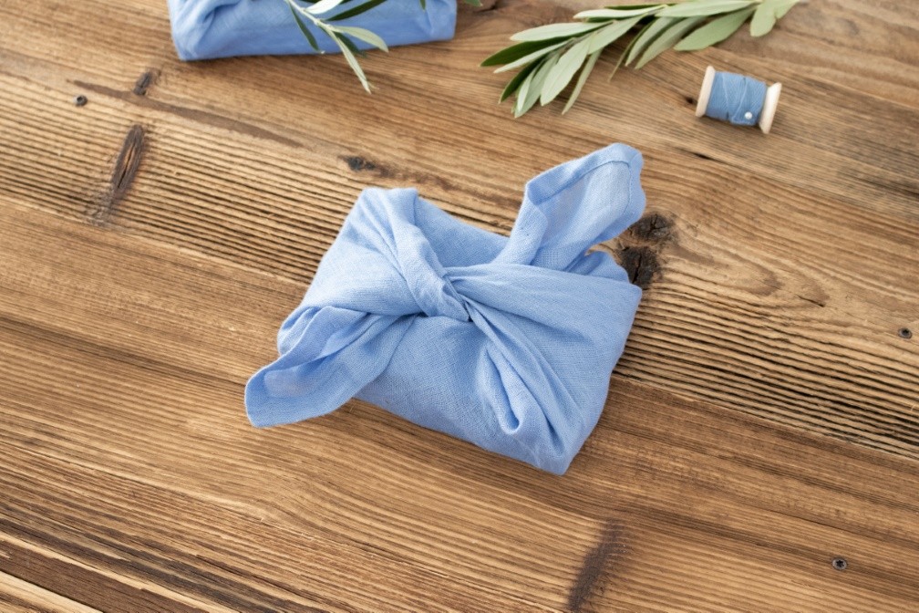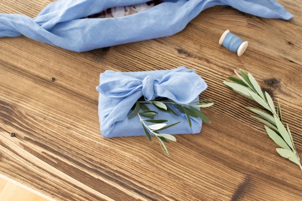 Nun kannst du die anderen beiden Ecken über dem Geschenk zusammenführen und verknoten. Schon ist deine Geschenkverpackung aus Stoff fertig und kann noch durch Schleifenband, Garn oder einen dekorativen Zweig verziert werden.