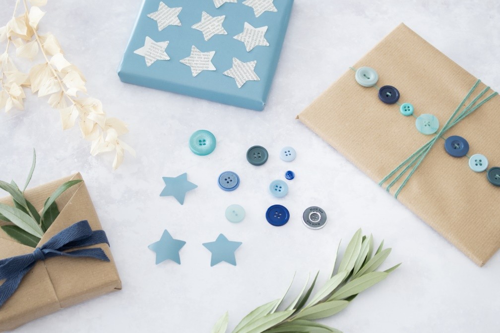 Bewahre Reste von Geschenkpapier, Zeitung und Stoffen auf, um daraus weitere Verzierungen zu basteln. Schneide oder stanze z. B. Sterne oder verschiedene geometrische Formen aus den Resten aus und nutze diese bei anderen Geschenkverpackungen als kleine Akzente.