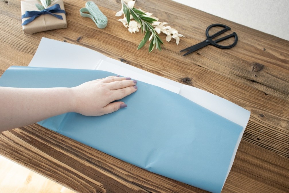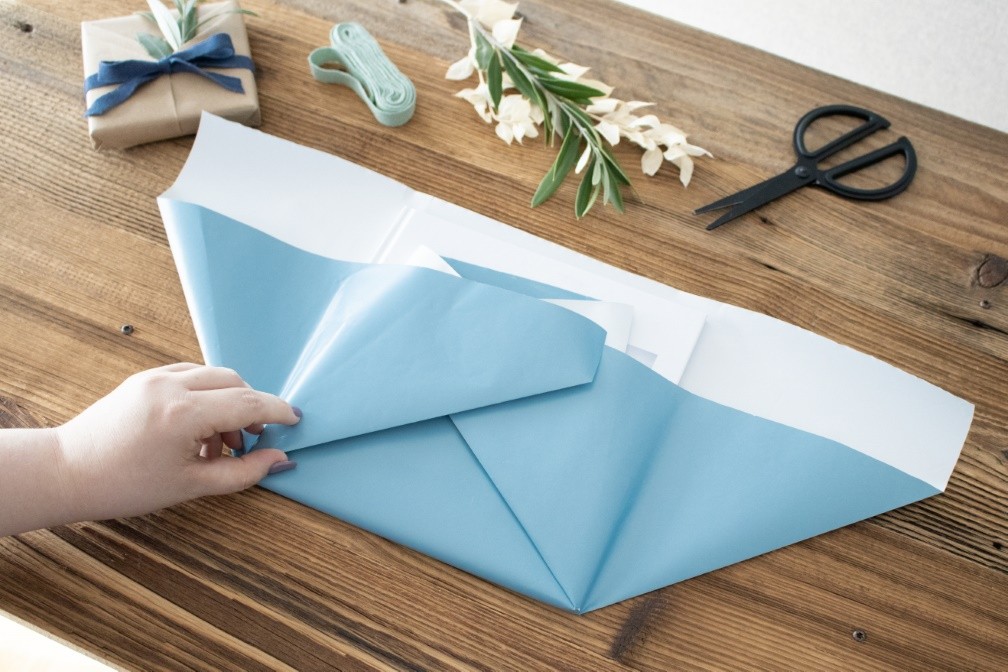 Im ersten Schritt des Einpackens klappst du die längere Seite hoch, sodass dein Geschenk zu mindestens Dreiviertel vom Papier bedeckt ist.
