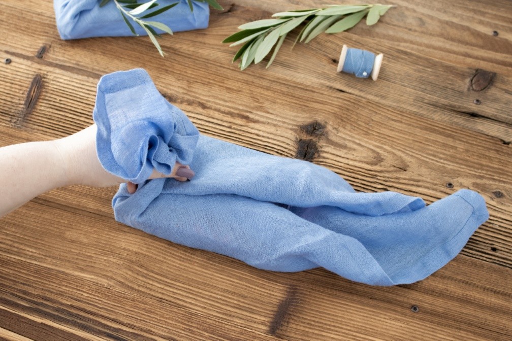 Stoffe und Servietten bieten sich für runde oder auch mehrteilige Geschenke besonders an, da sich das Material leicht anpasst und nicht wie Papier knittern oder reisst. Lege dein Geschenk dazu mittig auf das Tuch oder das Stück Stoff und rolle zwei sich gegenüberliegende Ecken etwas ein, um sie dann über das Geschenk zu legen – ähnlich wie bei einem Knallbonbon.