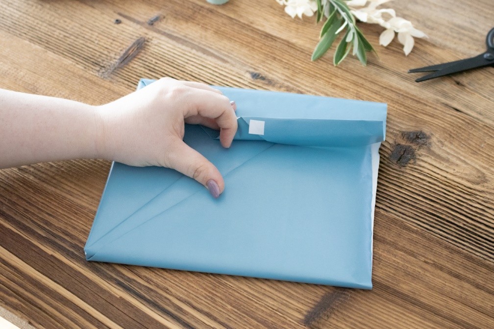 Da die Seiten im Wechsel über das Geschenk geschlagen werden, ist natürlich eine Seite ganz oben. Damit du einen sauberen Abschluss hast, falte die Kante einmal um, die in der Mitte des Geschenks endet. Anschliessend klebst du sie mit Klebeband oder einer Klebeecke fest.