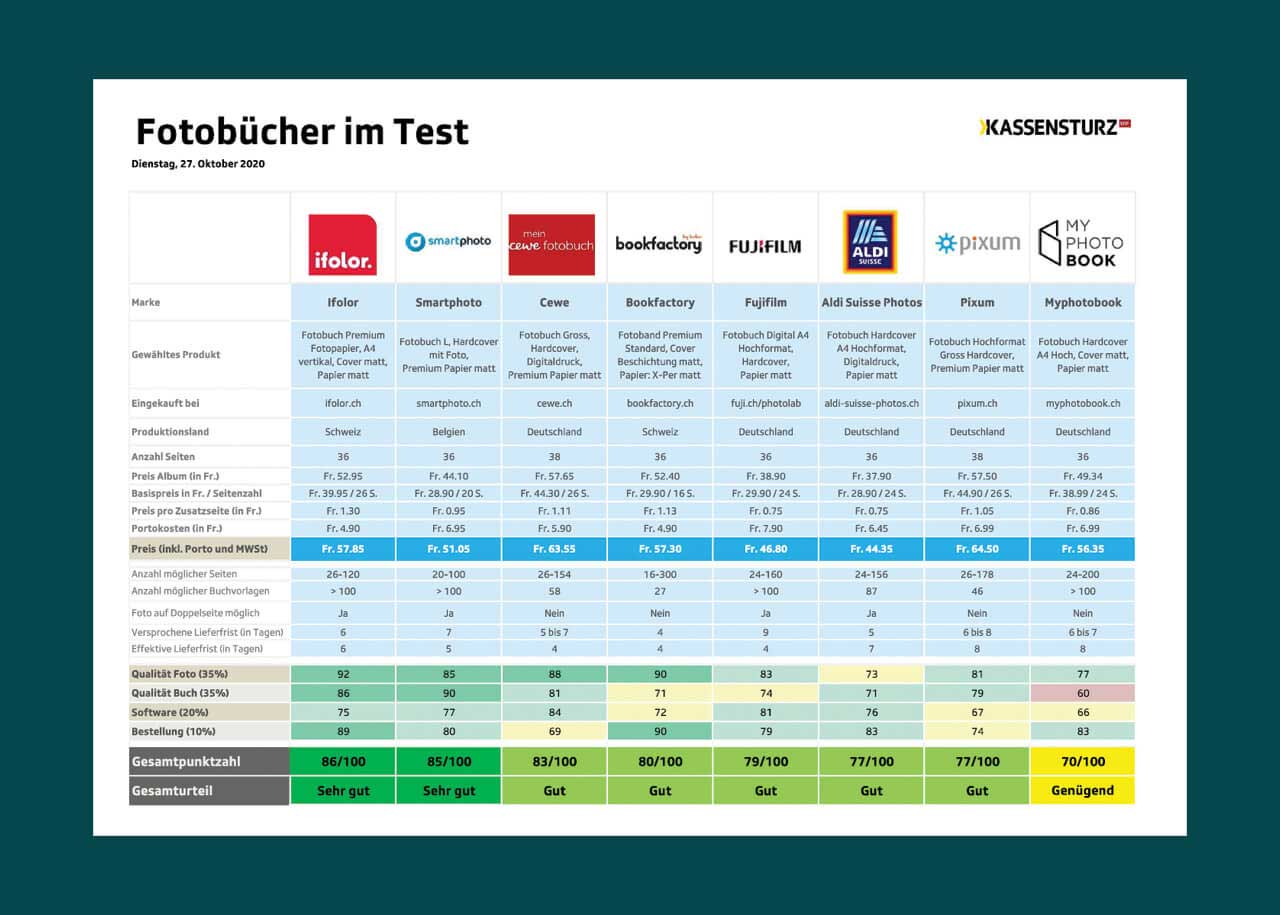 L’album fotografico ifolor è stato testato di nuovo dalla rivista Fototest edizione 05/2021. È stato esaminato l’album fotografico nel formato A4 orizzontale, copertina opaca, pagine interne opache. Questo prodotto ha ottenuto la valutazione «SUPER» con un punteggio complessivo di 90,5/100. La rilegatura è elegante e dotata di risguardi. Le sfumature di colore e la nitidezza vengono esaltate in modo naturale.