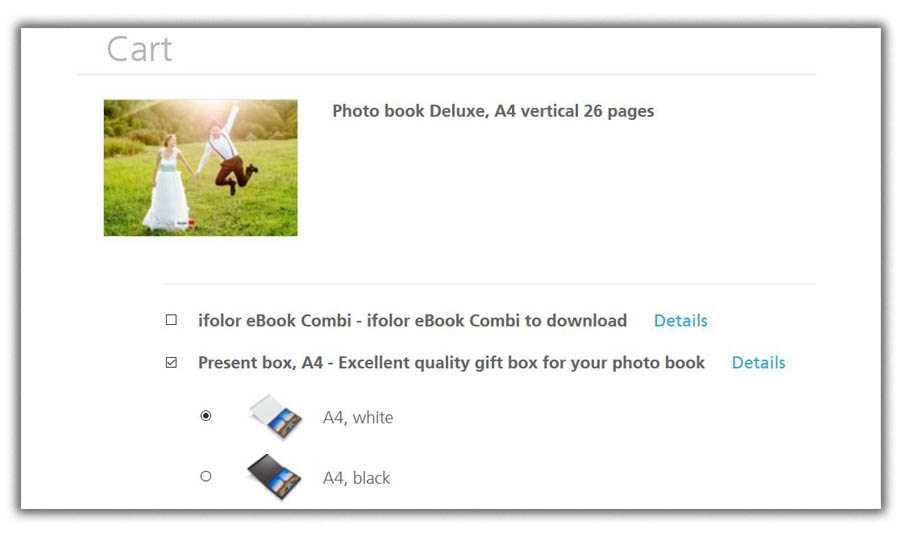 Dopo aver creato un album fotografico Deluxe, un album fotografico Premium o un album fotografico Premium su carta fotografica verrà visualizzata in automatico l’opzione della scatola regalo. È sufficiente aggiungere all’ordine la scatola regalo bianca o nera selezionando la casella appropriata nel carrello.