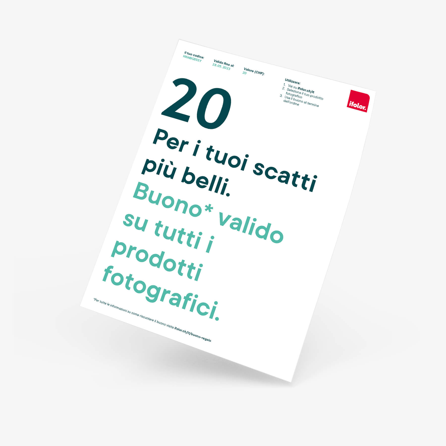 Ordina il buono ifolor da 20, 50 o 100 per fare un regalo speciale ai tuoi cari. Se il valore del buono è superiore all’importo totale dell’ordine, il credito residuo sarà accreditato sul tuo conto cliente e sarà automaticamente detratto da un ordine successivo. Il destinatario possa effettuare più ordini.