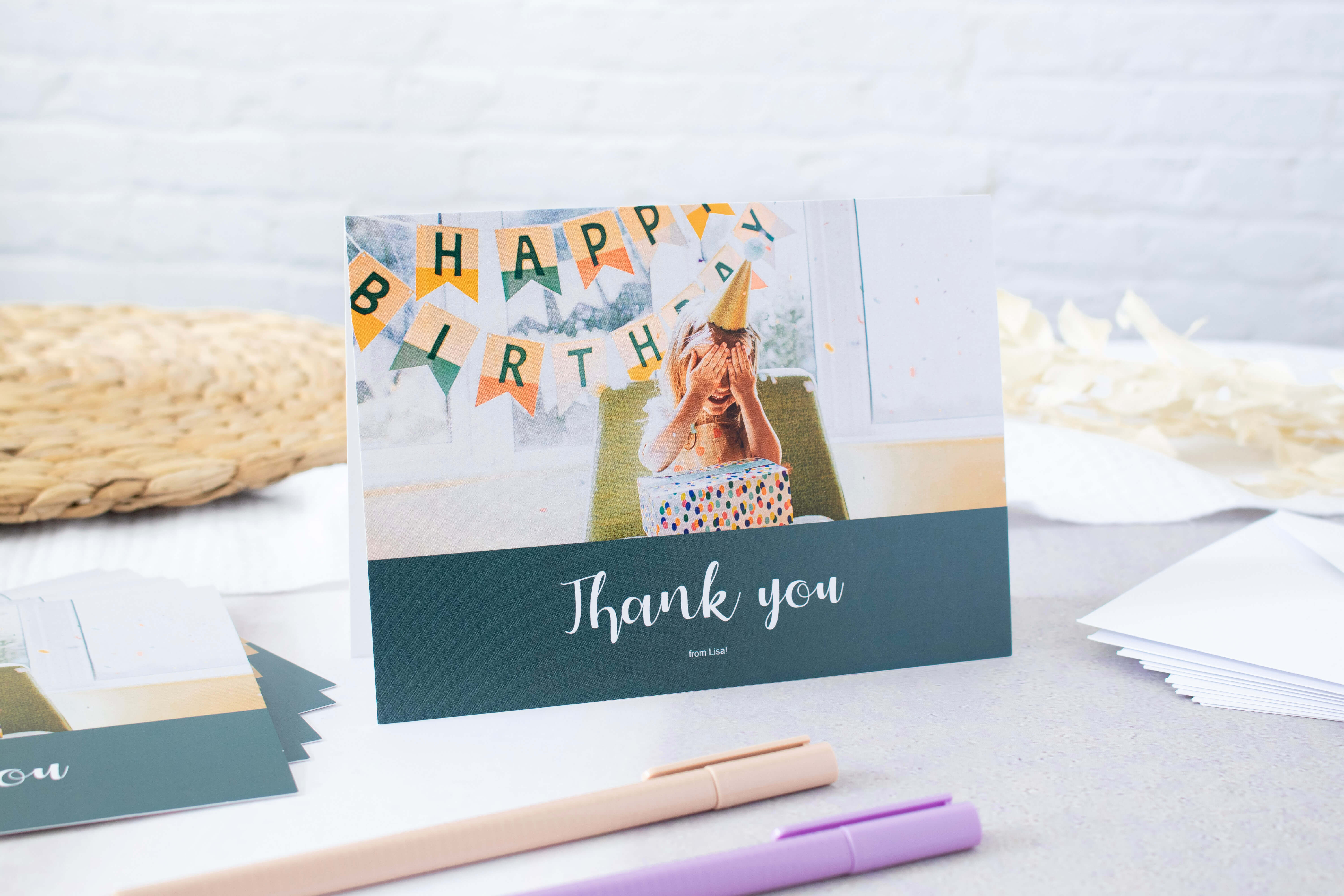 I diversi modelli di design della categorie “Compleanno” possono essere utilizzati non solo per gli inviti ma anche come biglietti di ringraziamento. Dai motivi simpatici a quelli più semplici, c’è un modello adatto per ogni compleanno. Troverai inoltre tanti design adatti per ringraziare gli ospiti dopo la festa di compleanno del tuo bambino. Sulla parte anteriore del biglietto puoi inserire la foto della festa di compleanno o una bella foto con il festeggiato, grande o piccino che sia. Oltre a un messaggio di ringraziamento per aver partecipato alla festa, i piccoli ospiti potranno così avere con sé una foto ricordo della festa.