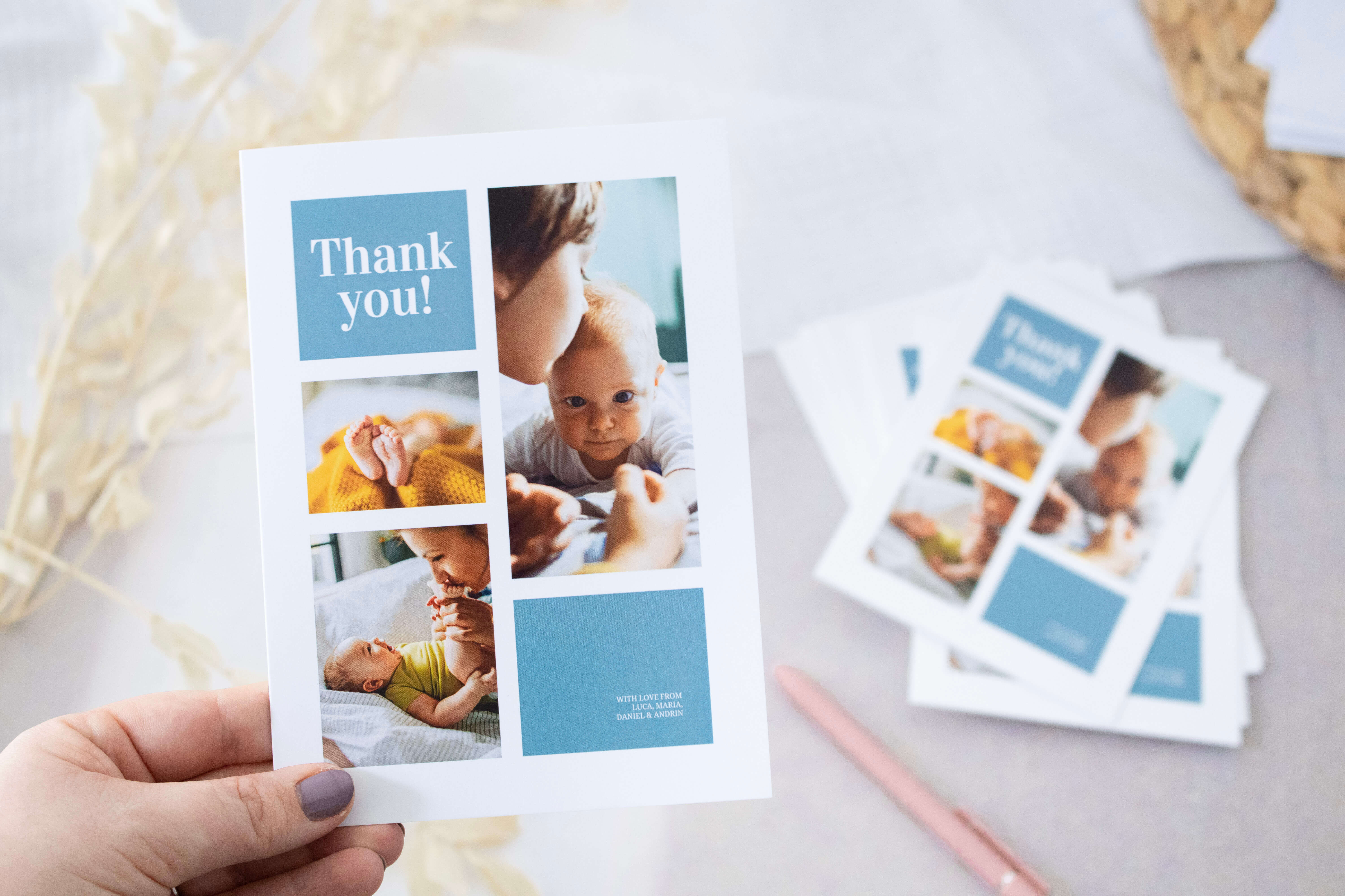 Tra i numerosi modelli di design, troverai anche quelli adatti per realizzare un biglietto di ringraziamento per il battesimo, la comunione o la cresima. Carica una foto del bambino o della bambina che riceve il sacramento, così i tuoi parenti, padrini e madrine riceveranno un bel ricordo della giornata trascorsa insieme. A seconda del modello scelto e del tipo di biglietto, puoi anche creare un piccolo collage sulla parte frontale dei biglietti di ringraziamento o aggiungere anche altre foto all’interno. Se vuoi lasciare i biglietti più neutri, ad esempio con una semplice dedica, puoi scegliere un design più semplice. All’interno o sul retro, trovi abbastanza spazio per inserire una frase adatta all’occasione e per le tue parole personali di ringraziamento.