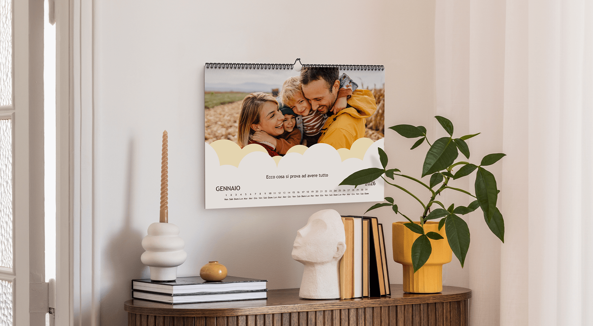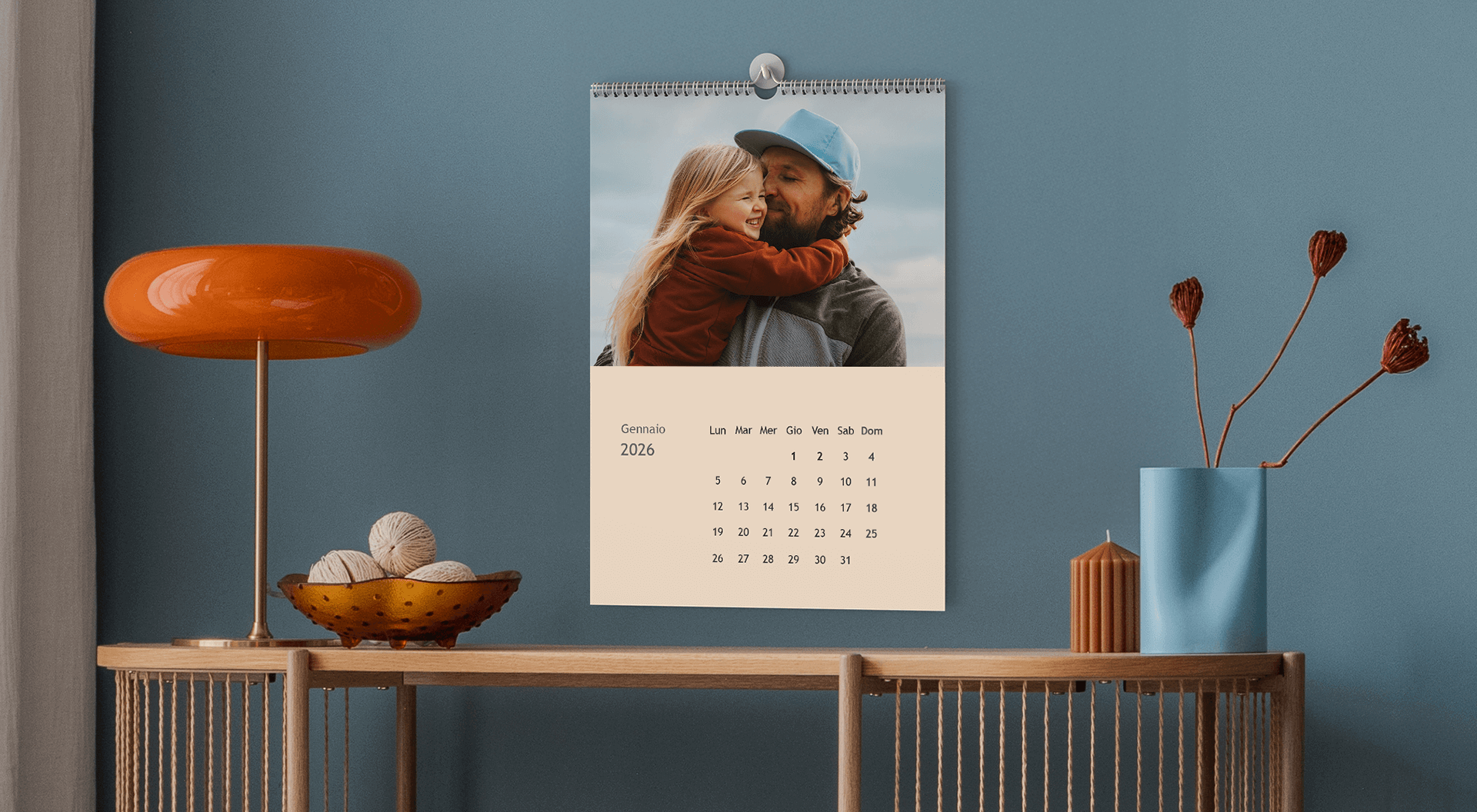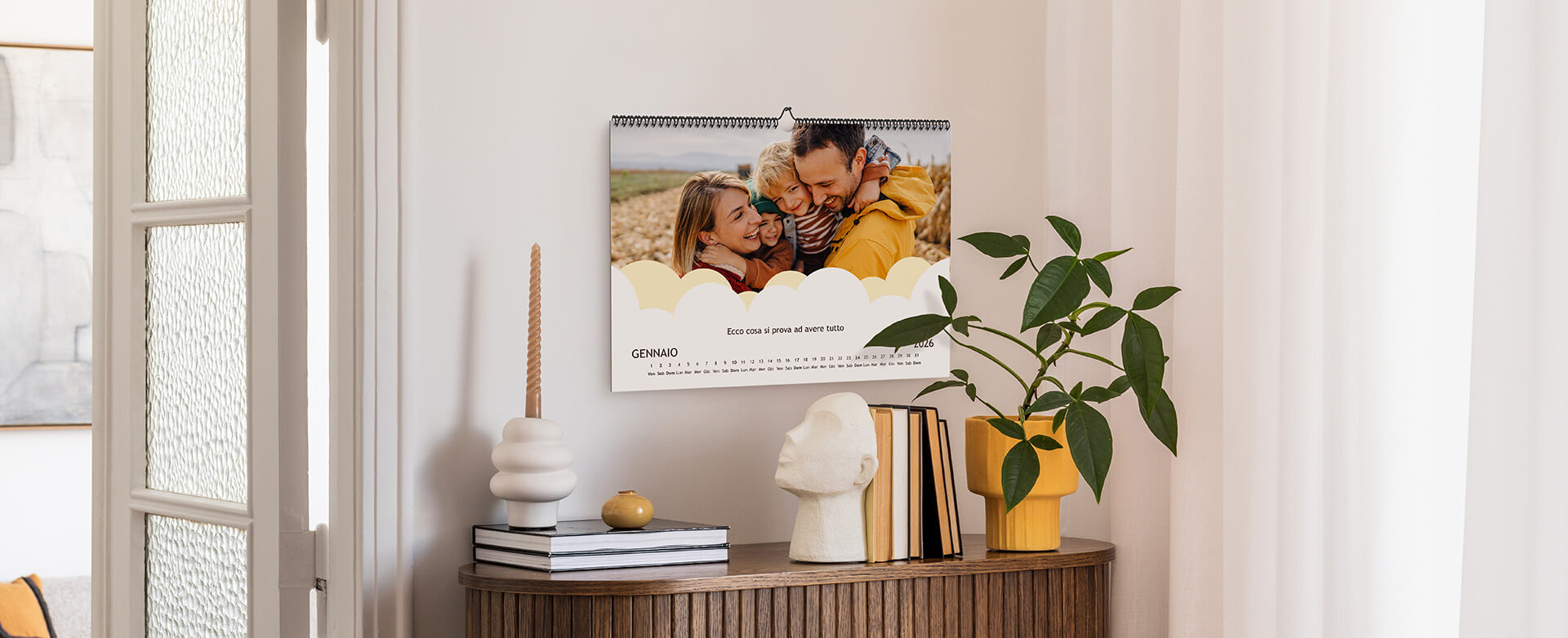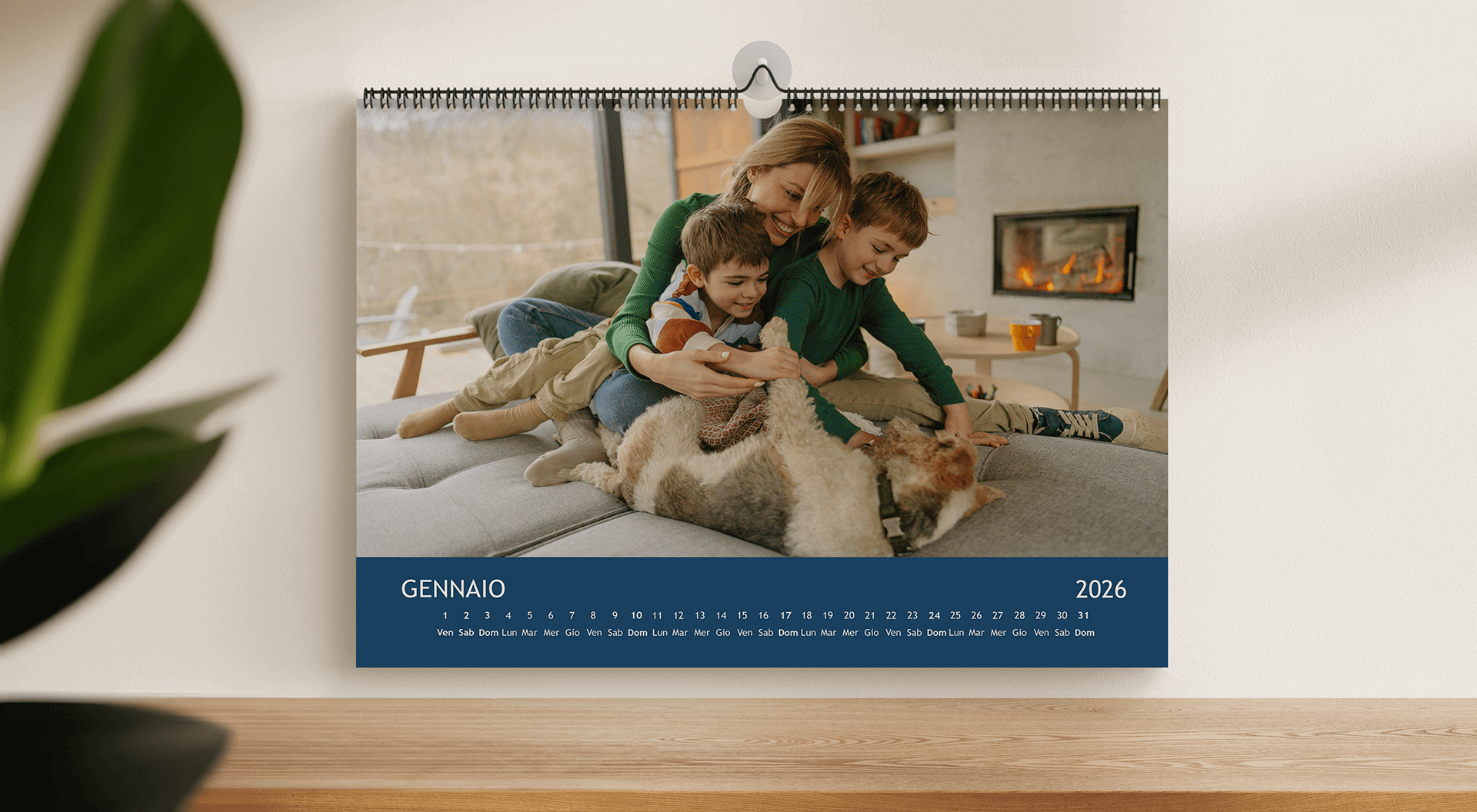 - Calendario da parete: Disponibile in diverse dimensioni, con carta satinata o lucida a scelta. Offre una chiara panoramica mensile ed è un elegante elemento decorativo che mette in risalto le tue foto preferite.
