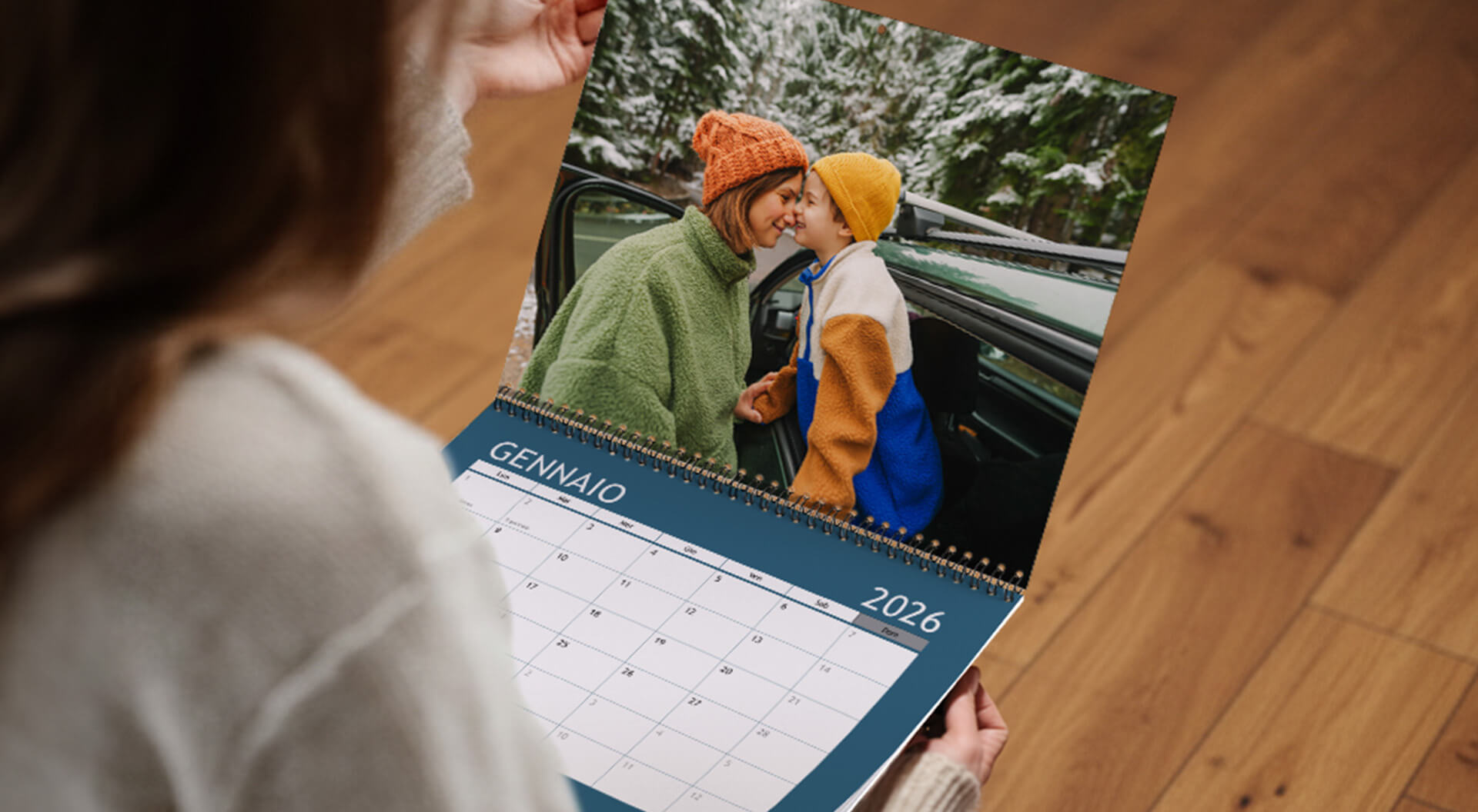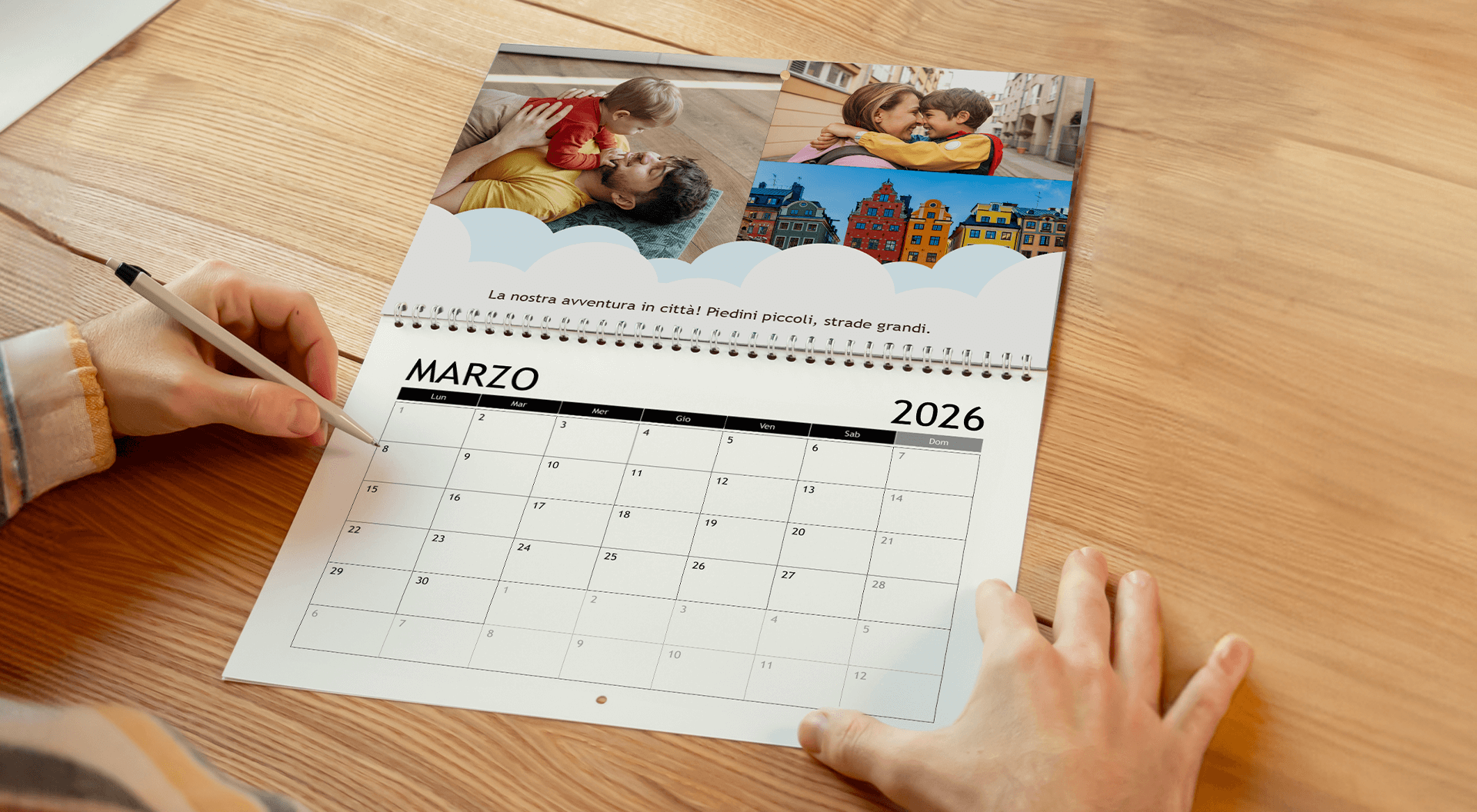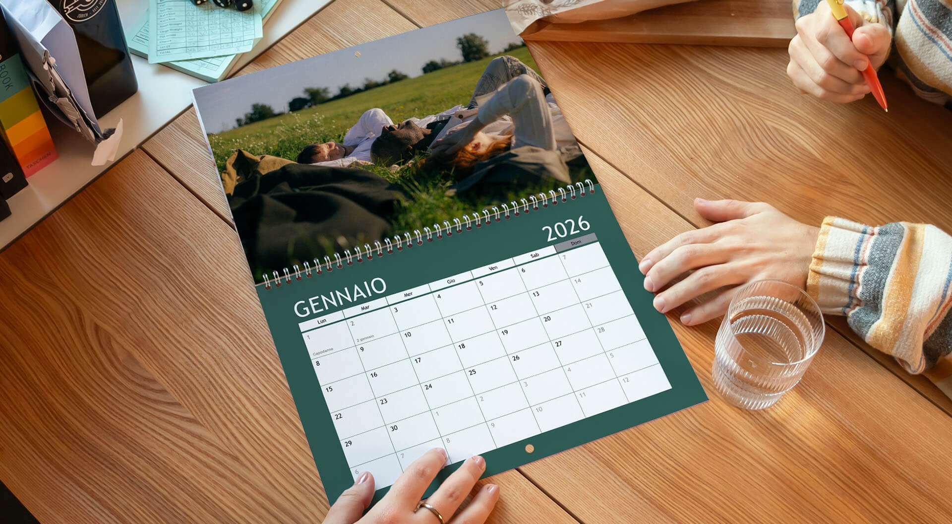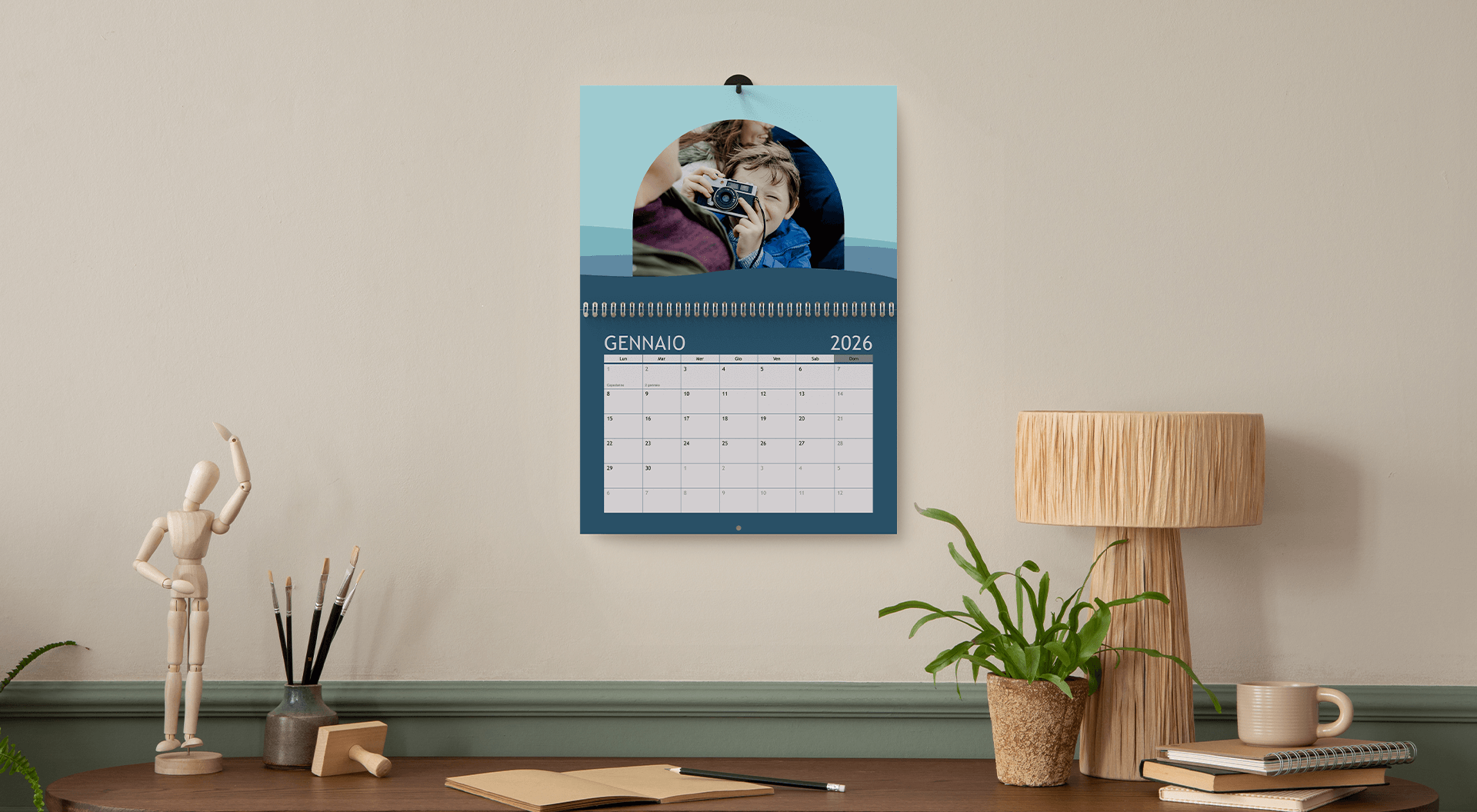 I calendari da parete e i pianificatori mensili sono molto popolari. Uno degli aspetti più belli della creazione del tuo calendario è poterlo riempire con foto che ti regalano particolare gioia. Foto di famiglia, ricordi di viaggio, tappe importanti della vita, disegni dei bambini: ogni pagina diventa un piccolo promemoria di ciò che conta davvero. Sia nel calendario da parete sia nel pianificatore mensile puoi scegliere una foto per ogni mese oppure inserirne diverse. In questo modo crei un ritmo annuale ricco di gioia, nostalgia e ispirazione.
