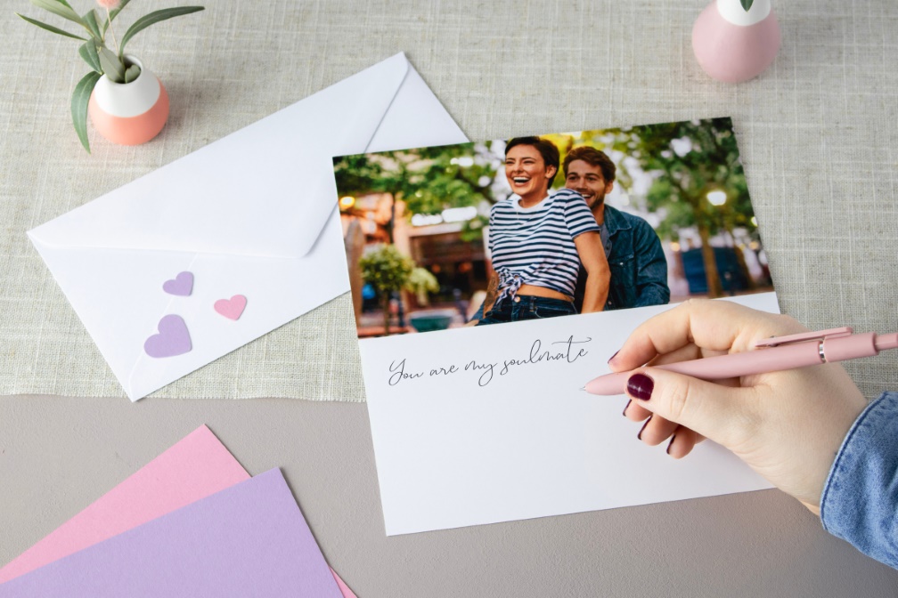Se il giorno di San Valentino vuoi sorprendere la tua dolce metà, la tua migliore amica o il tuo migliore amico, una cartolina d’auguri personalizzata è il regalo migliore. La foto vi ricorderà dell’ultima vacanza insieme e vi permetterà di rivivere quei momenti. Scopri tutti i diversi formati e le idee di design per i biglietti di San Valentino e crea una cartolina fotografica con le vostre foto ricordo e qualche parola di apprezzamento e di affetto. Dalle più romantiche a quelle più spiritose, abbiamo elencato qui di seguito alcune frasi che ti ispireranno per completare il tuo biglietto di San Valentino.