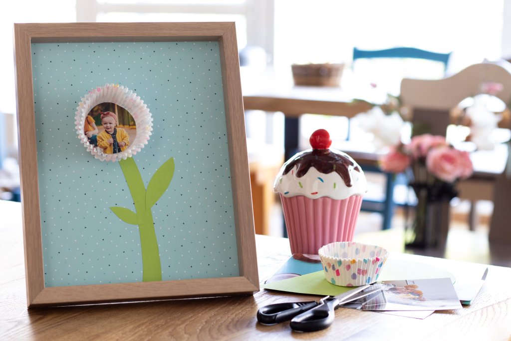 - Inserite il motivo con gli steli e le foglie nella cornice e incollate, per finire, gli stampini per i muffin con le vostre foto all’estremità degli steli, come se fossero i fiori