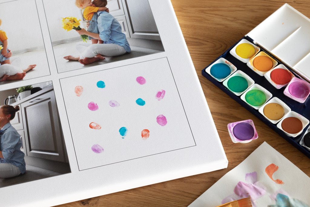 Con l’aiuto delle foto di famiglia più belle e un po’ di colori a dita, crea insieme al tuo bambino un piccolo capolavoro per la Festa della Mamma. Anche questa idea, facilissima da realizzare, è ideale per i bimbi piccoli. Crea innanzitutto una foto su tela con i vostri scatti fotografici più belli. Il formato quadrato e il design «collage» con quattro segnaposti è l’ideale per questo progetto. Lascia libero uno dei segnaposti, dove il tuo bambino potrà aggiungere successivamente l’impronta della sua manina e lasciare così la sua firma.