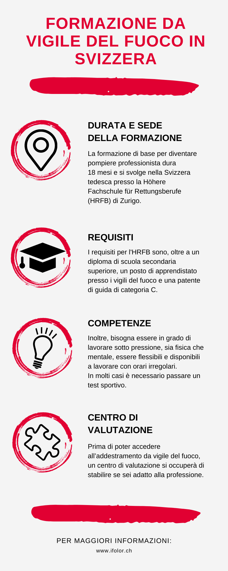 La formazione di base per diventare pompiere professionista dura 18 mesi e si svolge nella Svizzera tedesca presso la Höhere Fachschule für Rettungsberufe (HRFB) di Zurigo. I requisiti per l'HRFB sono, oltre a un diploma di scuola secondaria superiore (ad es. maturità o formazione professionale completa con attestato federale di capacità), un posto di apprendistato presso i vigili del fuoco e una patente di guida di categoria C. Inoltre, bisogna essere in grado di gestire pressione sia fisica che mentale, essere flessibili e disposti a lavorare con orari irregolari. In molti casi è necessario passare un test sportivo, nonché una valutazione in un centro adibito a verificare la compatibilità alla professione. L'età ideale per la formazione da vigili del fuoco professionisti è tra i 23 e i 35 anni.