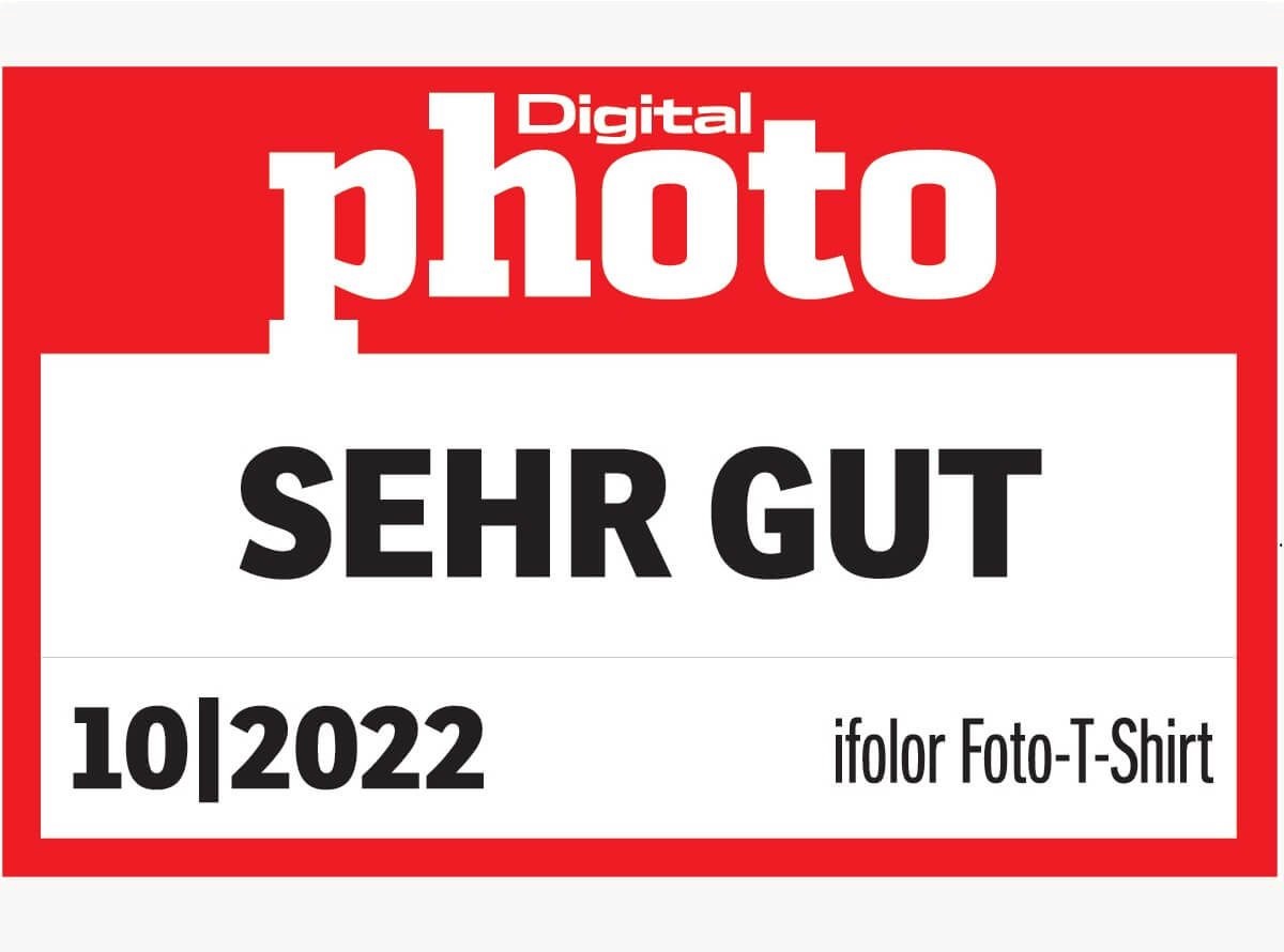 Das Magazin DigitalPHOTO testet in der Ausgabe 10/22 Foto-Sonderprodukte, die sich als kreative Fotogeschenke eignen. ifolor schickt das Foto T-Shirt ins Rennen und wird mit dem Prädikat «SEHR GUT» bewertet. Das Foto T-Shirt punktet mit brillanten Farben und einer hohen Schärfe und macht dank der Bio-Fairtrade-Baumwolle einen hochwertigen sowie langlebigen Eindruck.