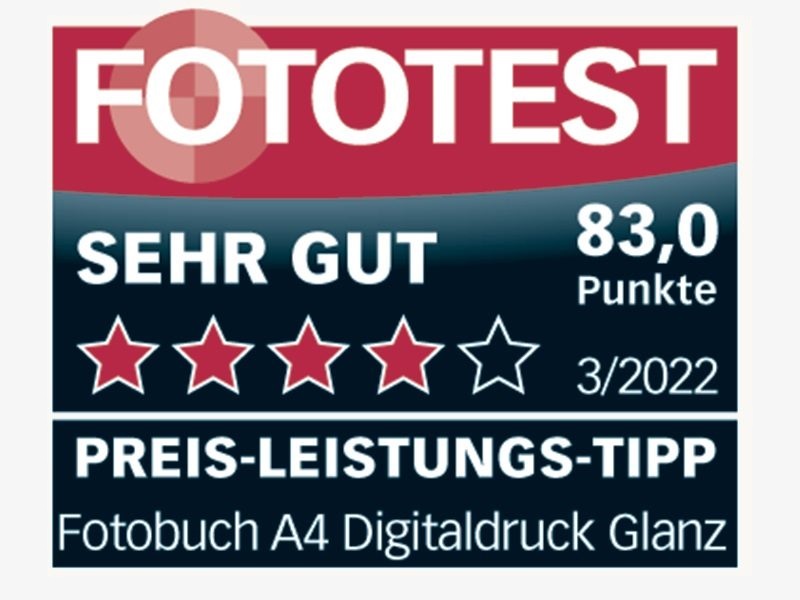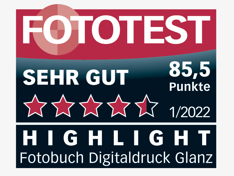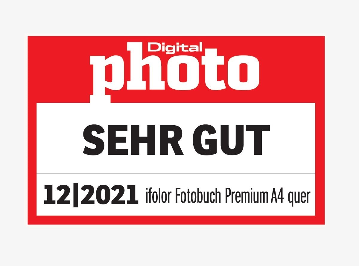 Erneut wurde das Fotobuch von ifolor im Fototest in der Ausgabe 01/2022 getestet und bewertet. Untersucht wurde das Fotobuch Deluxe 28x28cm, quadratisch, Digitaldruck, Innenseiten glänzend. Erzielt wird wieder das Testprädikat «SEHR GUT» mit einer Gesamtbewertung von 85.5/100 Punkten. Das Fotobuch ist mit schönem Vorsatzpapier ausgestattet und exakt verarbeitet. Die natürliche Schärfe, der minimale Druckraster sowie die tolle Farbwiedergabe werden als positiv bewertet.