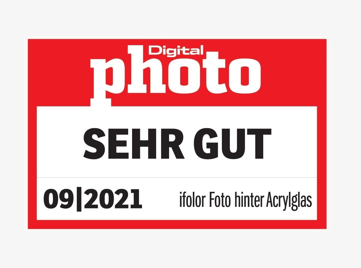 DigitalPHOTO testet in der Ausgabe 09/21 insgesamt sieben Anbieter für Acyrlglas-Wandbilder. Ifolor punktet dabei besonders mit der Qualität des Direktdrucks auf eine 5 Milimeter dicke Acrylglasplatte und wird als einwandfreies Produkt beschrieben. Damit erzielt ifolor das Prädikat «SEHR GUT».
