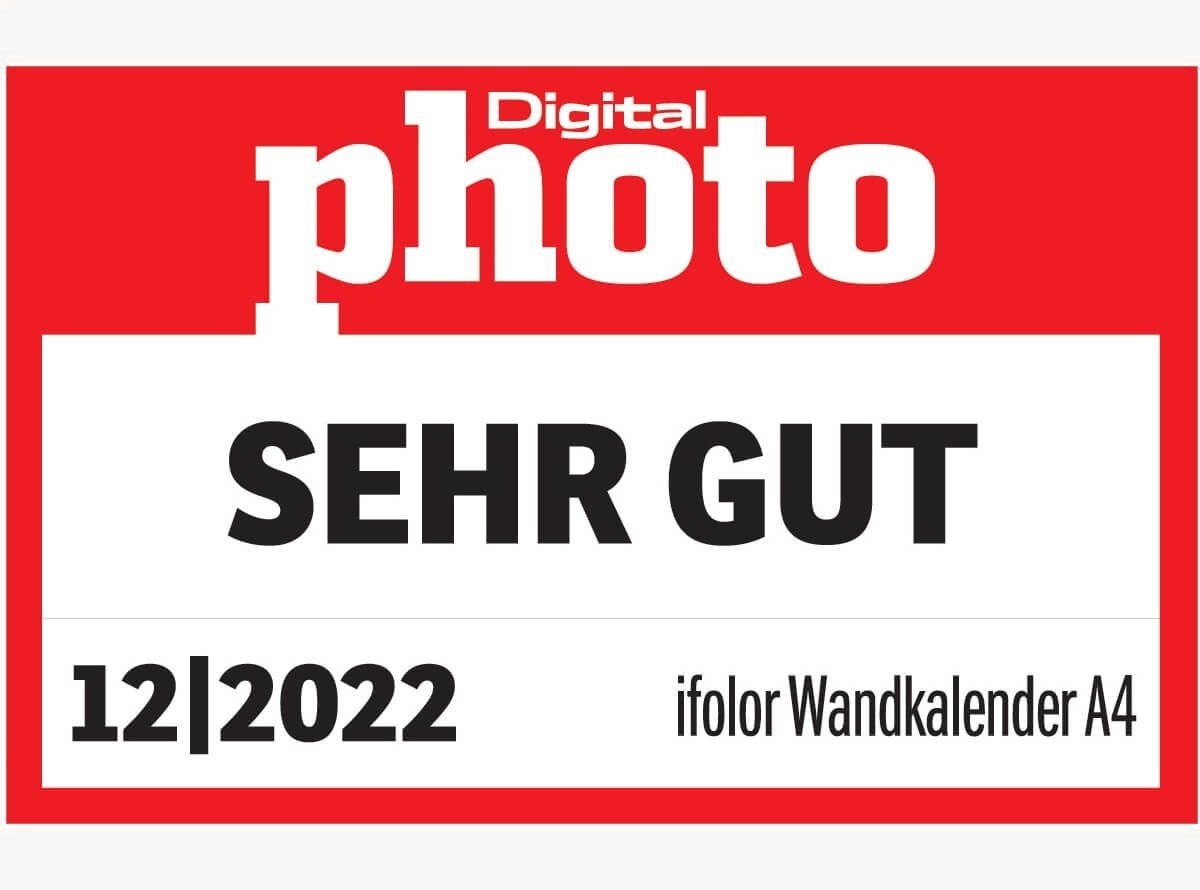 In der Digitalphoto Ausgabe 12/2022 wird ein grosser Test von sechs hochwertigen Fotokalender durchgeführt. ifolor ist darin auch mit dem Produkt Wandkalender, A4 hoch, vertreten. Das Testprädikat «SEHR GUT» mit einer Gesamtbewertung von 4.5/5 Sternen wird erzielt. Besonders betont wird hier die erstklassige Verarbeitung sowie den ausgezeichneten Druck.