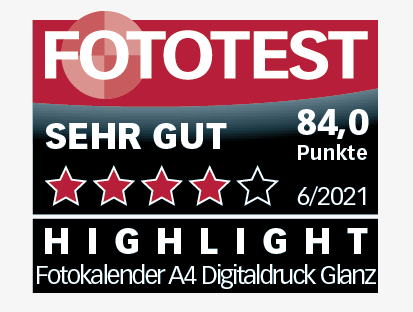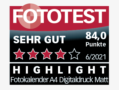 In der aktuellen Ausgabe der Zeitschrift Fototest Ausgabe 06/2021 wird der Wandkalender, A4 Digitaldruck, matt getestet. Erzielt wird das Testprädikat «SEHR GUT» mit einer Gesamtbewertung von 84/100 Punkten. Der Digitaldruck weisst natürliche Hauttöne und eine sehr gute Schärfe auf. Zudem ist die Spiralbindung exzellent.