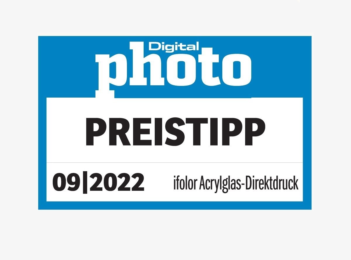 In der Ausgabe 09/22 der Zeitschrift DigitalPHOTO wird der Acrylglas-Direktdruck von sechs Profi-Dienstleistern getestet. Bei allen Anbietern wurde das gleiche Ausgangsfoto als Querformatbild in 30 x 40 cm bestellt. Das Acrylglas von ifolor wird mit einem top Preis-Leistungs-Verhältnis bewertet und erhält gesamthaft das Prädikt «PREISTIPP».