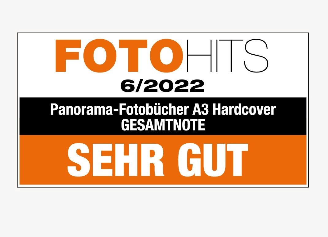 Fotohits hat in der Ausgabe 06/22 total zehn XXL-Panoramafotobücher von diversen Herstellern getestet. Das Panorama-Fotobuch A4 Hardcover von ifolor ist gemäss der Redaktion sorgfältig produziert und gut verarbeitet. Weiter wird hervorgehoben, dass das Cover plan schliesst und der Buchrücken rechtwinklig zu den Umschlagseiten steht. ifolor wird in diesem grossen Test mit dem Prädikat «SEHR GUT» ausgezeichnet.