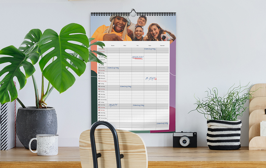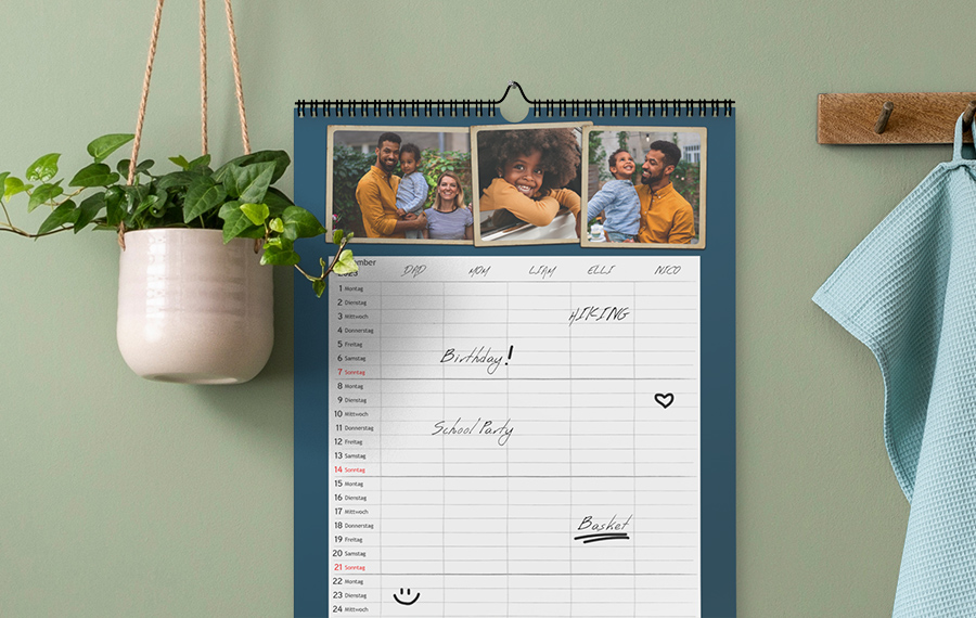 Den monatlichen Terminplan immer im Blick: Im ifolor Familienkalender hast du extra viel Platz für wichtige Termine und Eintragungen der ganzen Familie. Für bis zu fünf Familienmitglieder steht jedem eine eigene Spalte zur Verfügung. Du gestaltest jedes Kalenderblatt mit den schönsten Schnappschüssen deiner Lieben und wählst aus verschiedenen Designvorlagen aus.